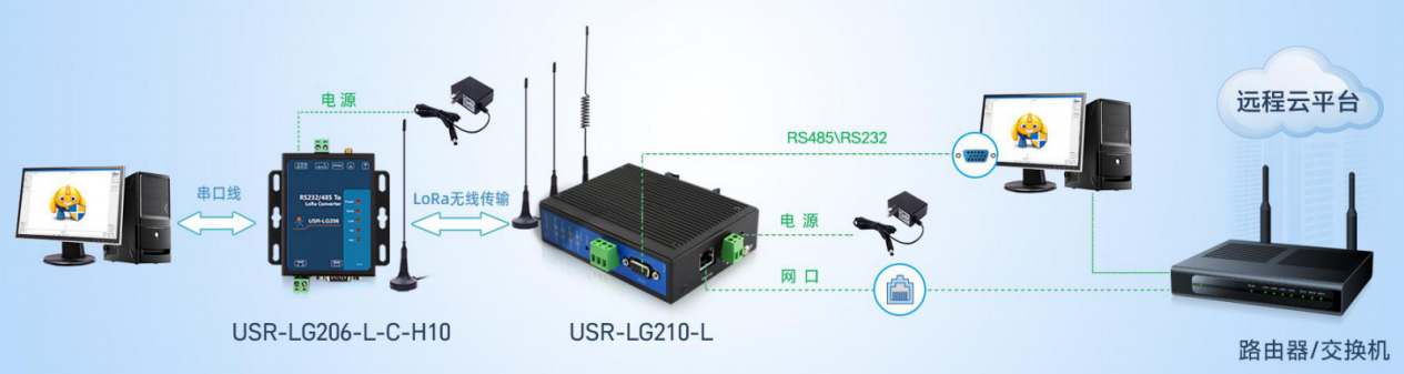 lora無線網(wǎng)關(guān)LG210與lora節(jié)點(USR-LG206-L-C-H10)安裝天線,使用各自配套電源適配器供電, LG210與LG206串口連接電腦,LG210網(wǎng)口連接路由器或者交換機(jī),電腦也接入該路由器或交換機(jī)。
