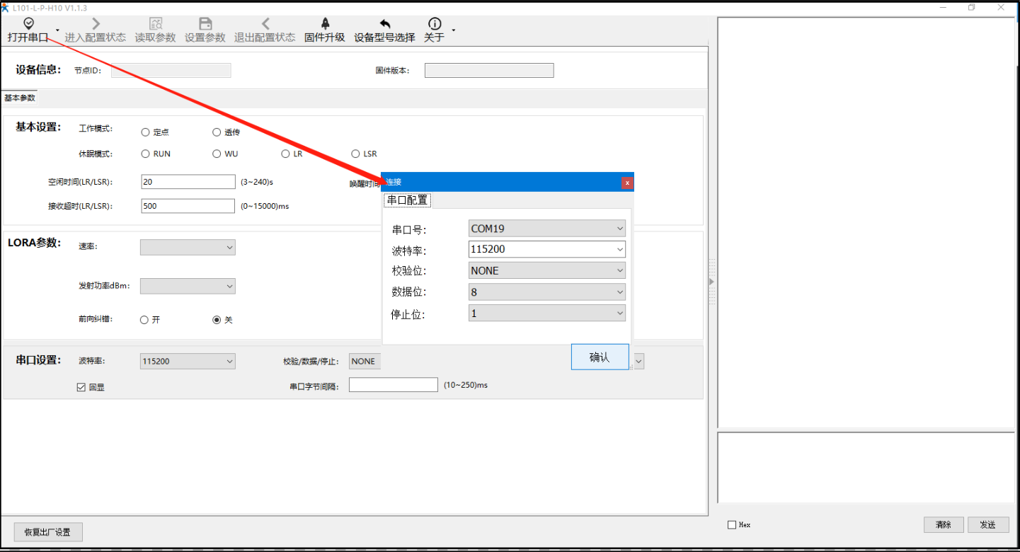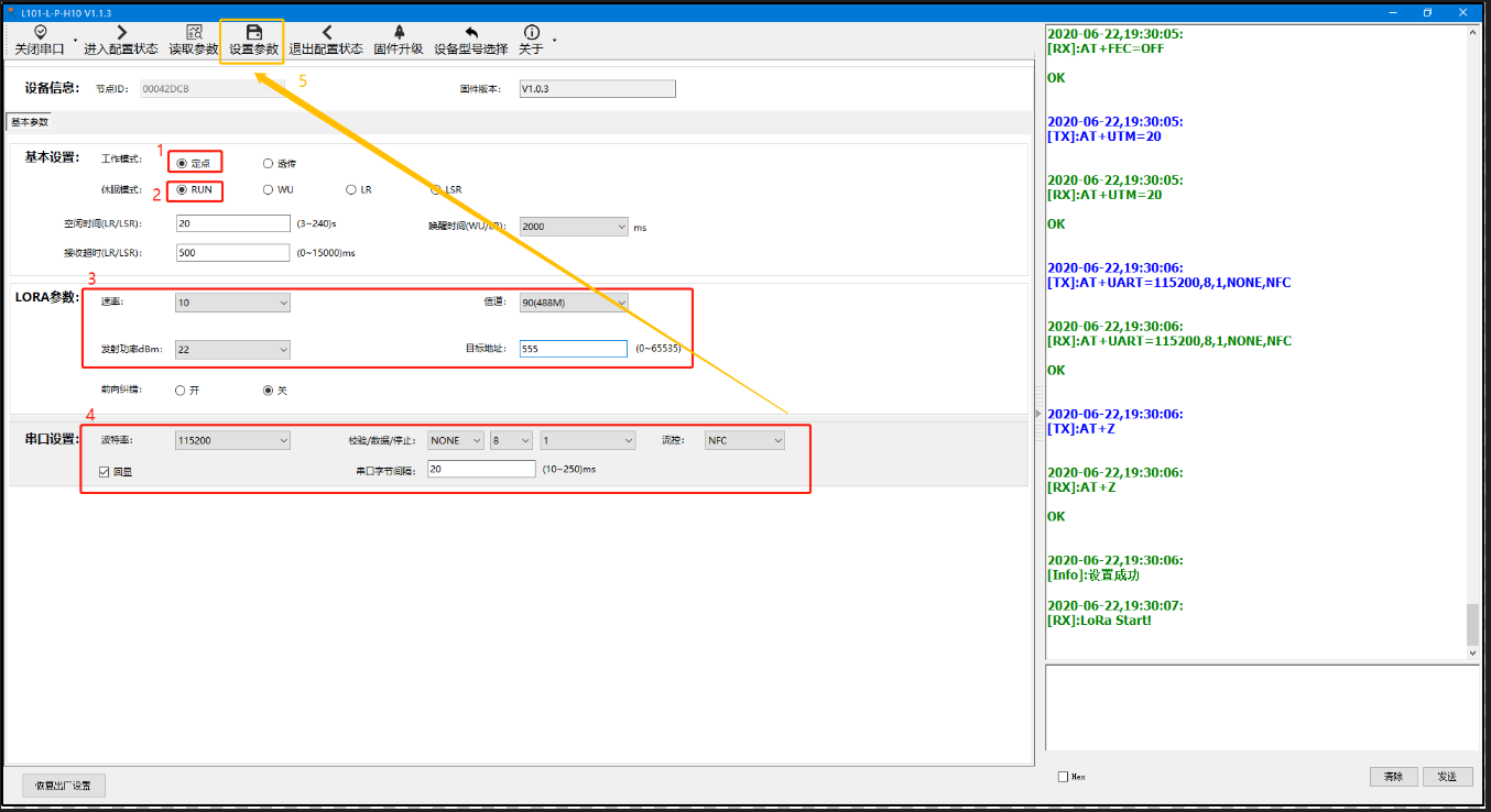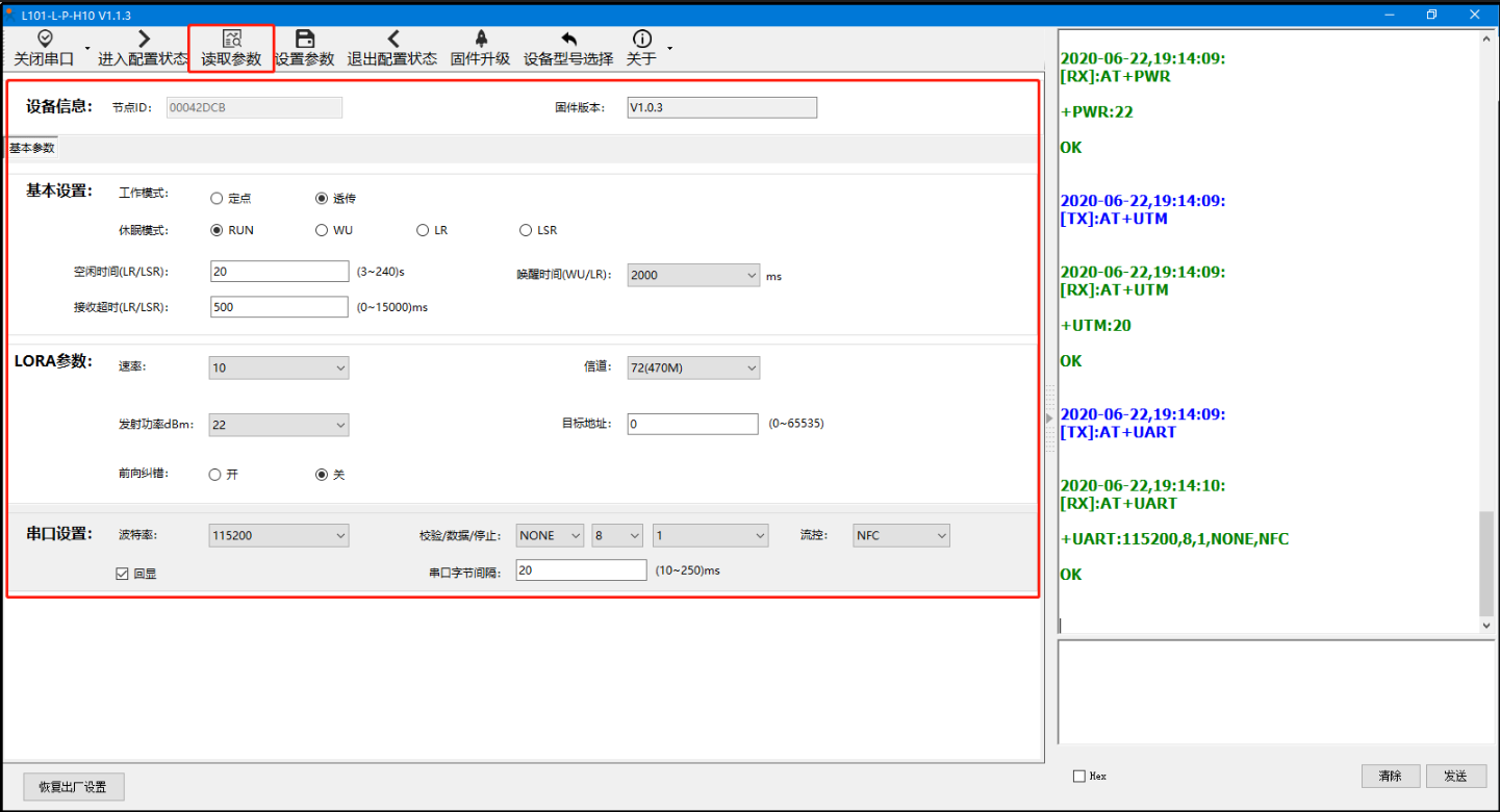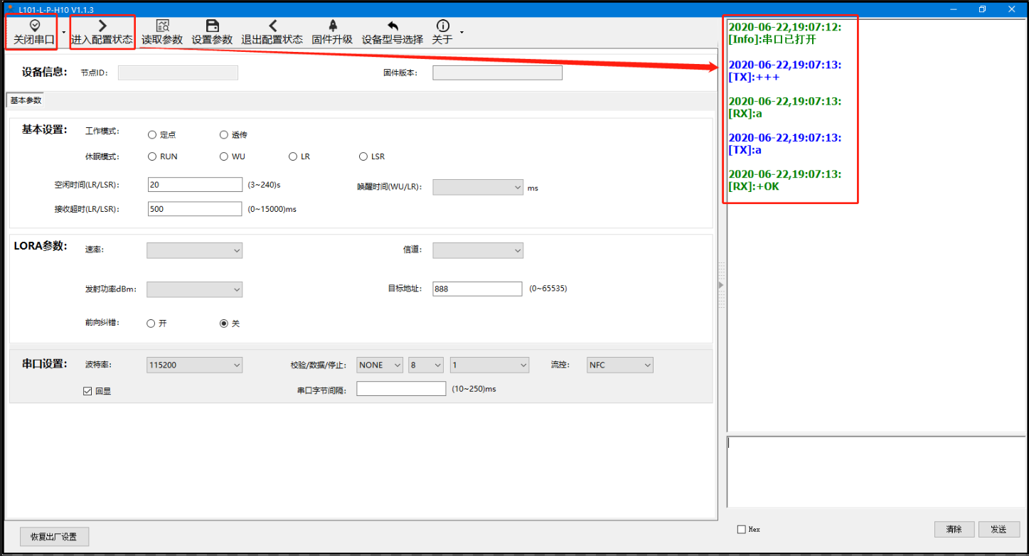 A、打開LoRa設(shè)置軟件(產(chǎn)品型號(hào)選擇為L101-L-p-H10),依次點(diǎn)擊打開串口(選擇A、B對(duì)應(yīng)的串口號(hào),串口參數(shù):115200,None,8,1,NFC)、進(jìn)入配置狀態(tài)、讀取參數(shù)、配置上表中的參數(shù)、一鍵設(shè)置所有參數(shù),關(guān)閉LoRa設(shè)置軟件。