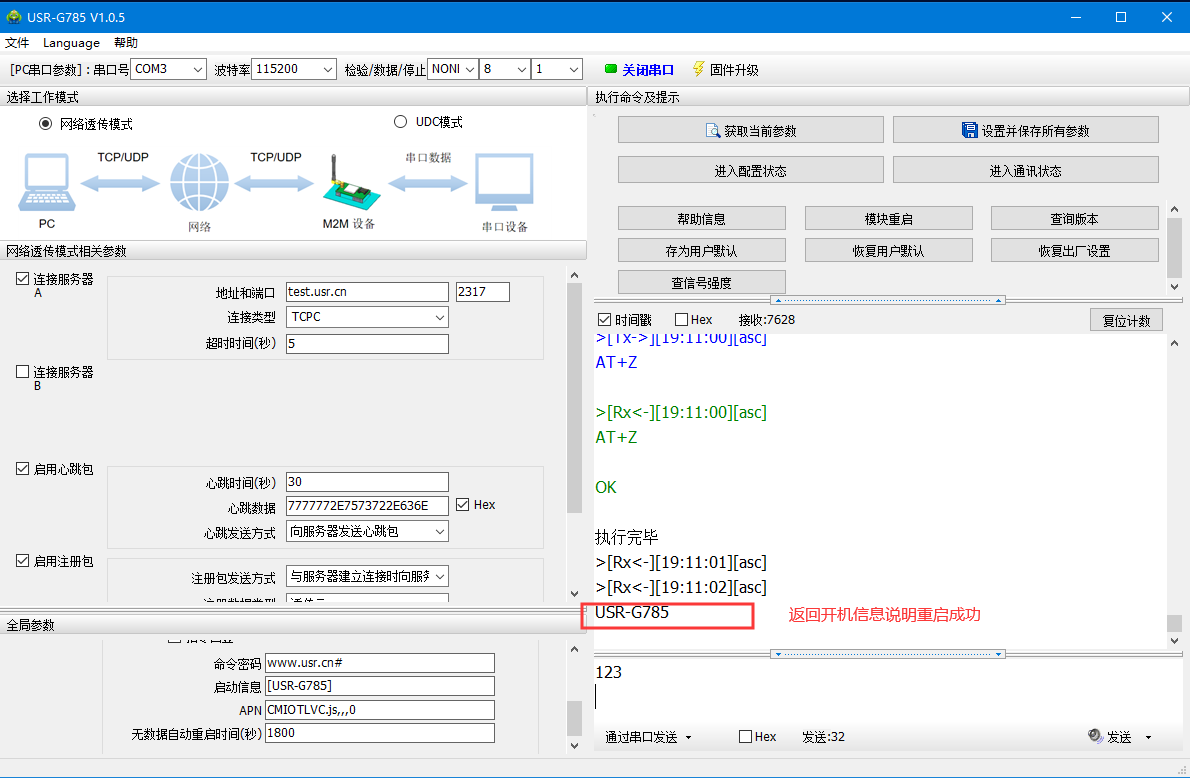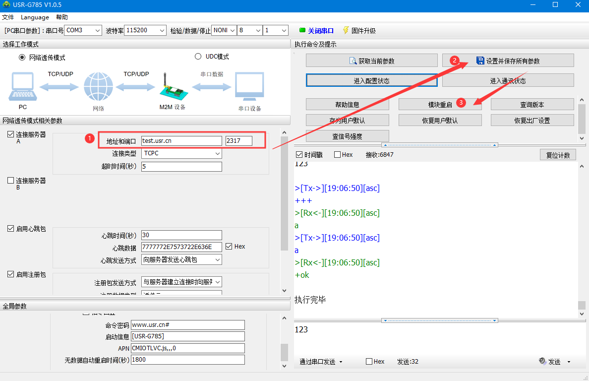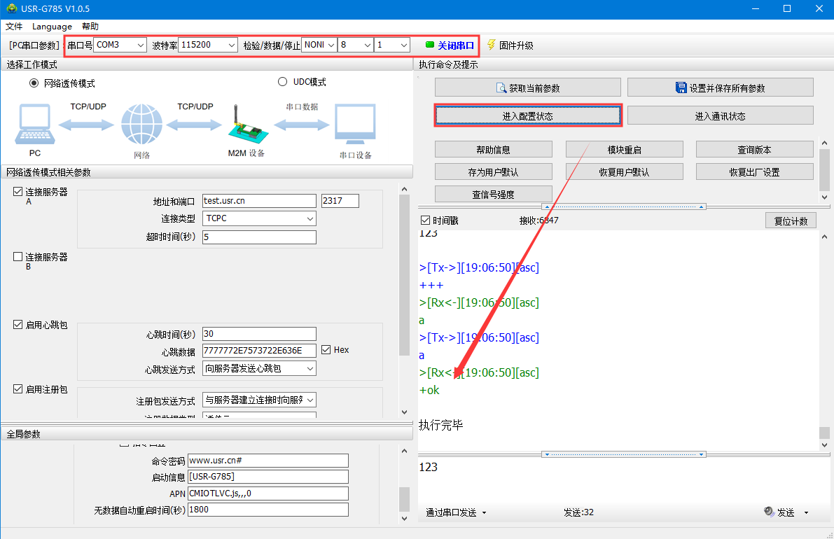 (1) 硬件連接:裝上sim卡,接上天線,785的串口通過(guò)USB轉(zhuǎn)RS232/485接到PC上,用我司提供的適配器供電。