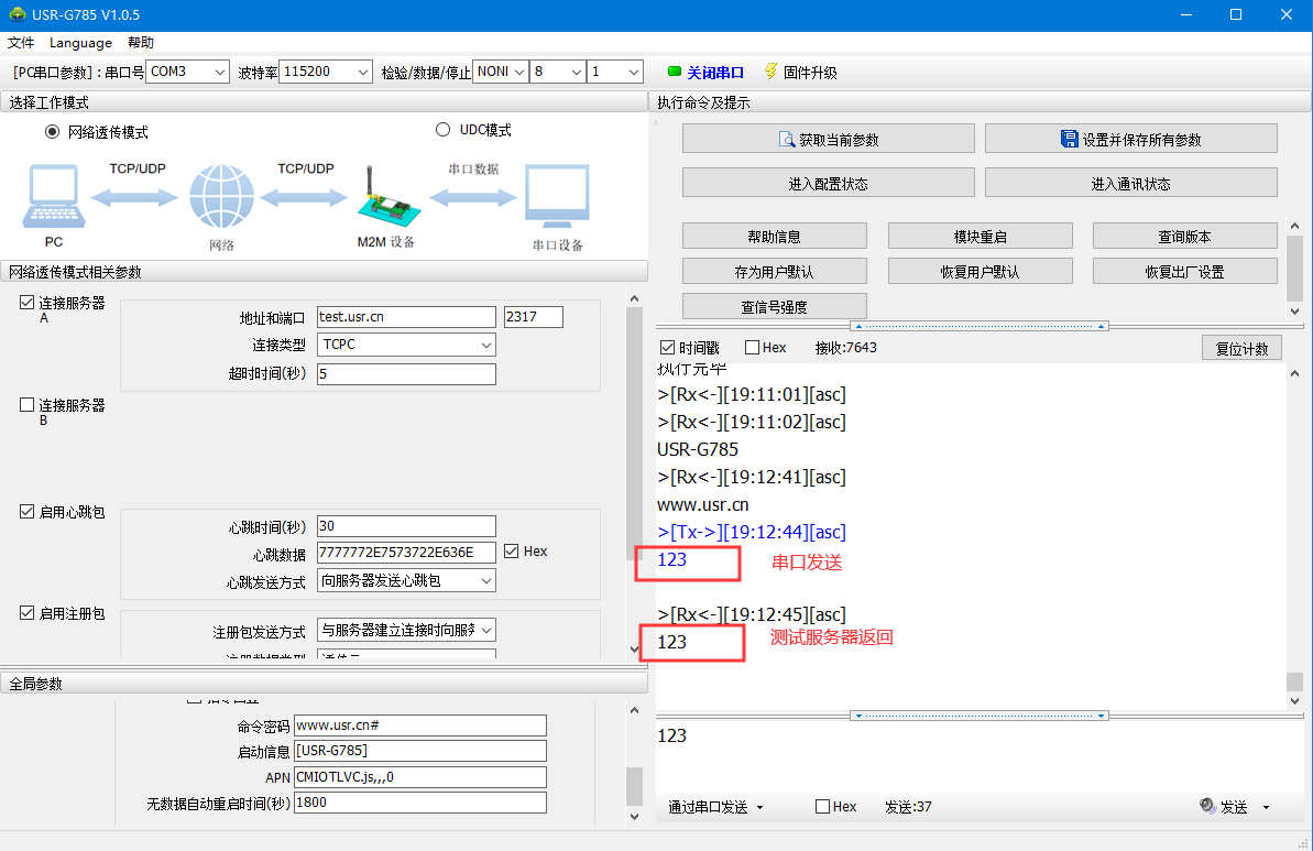 通過(guò)串口發(fā)送<123>,可以看到服務(wù)器返回了相同的內(nèi)容,說(shuō)明DTU工作是沒(méi)有問(wèn)題的