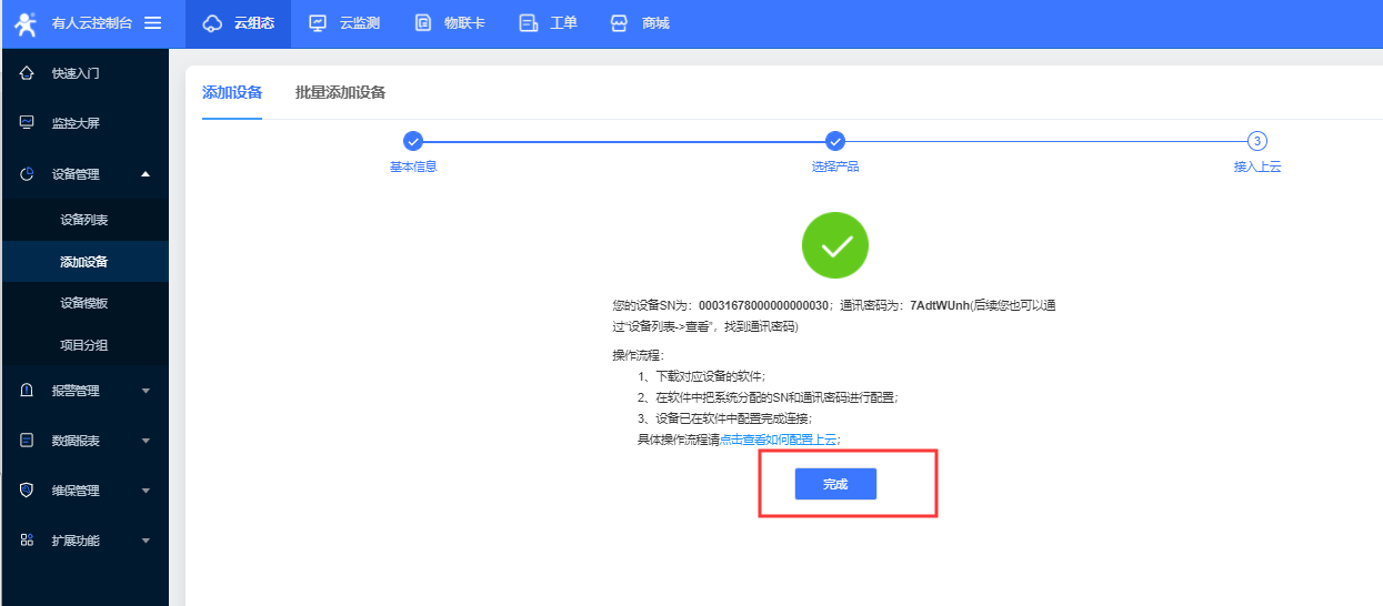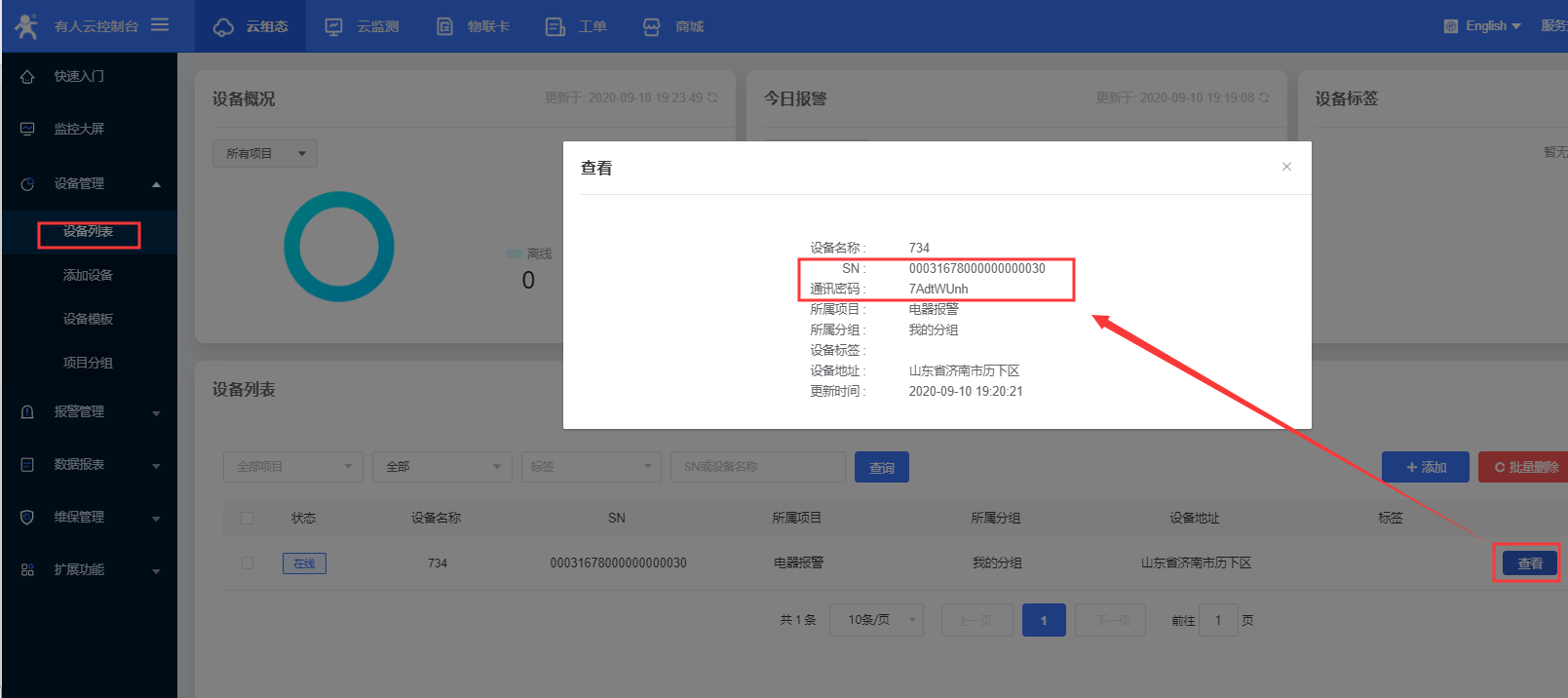 (3)設(shè)置有人云的地址:clouddata.usr.cn 端口15000;在有人云查看設(shè)備編號和通訊密碼,SN即設(shè)備編號,將SN和通訊密碼分別復(fù)制到設(shè)備軟件的設(shè)備編號和通訊密碼;