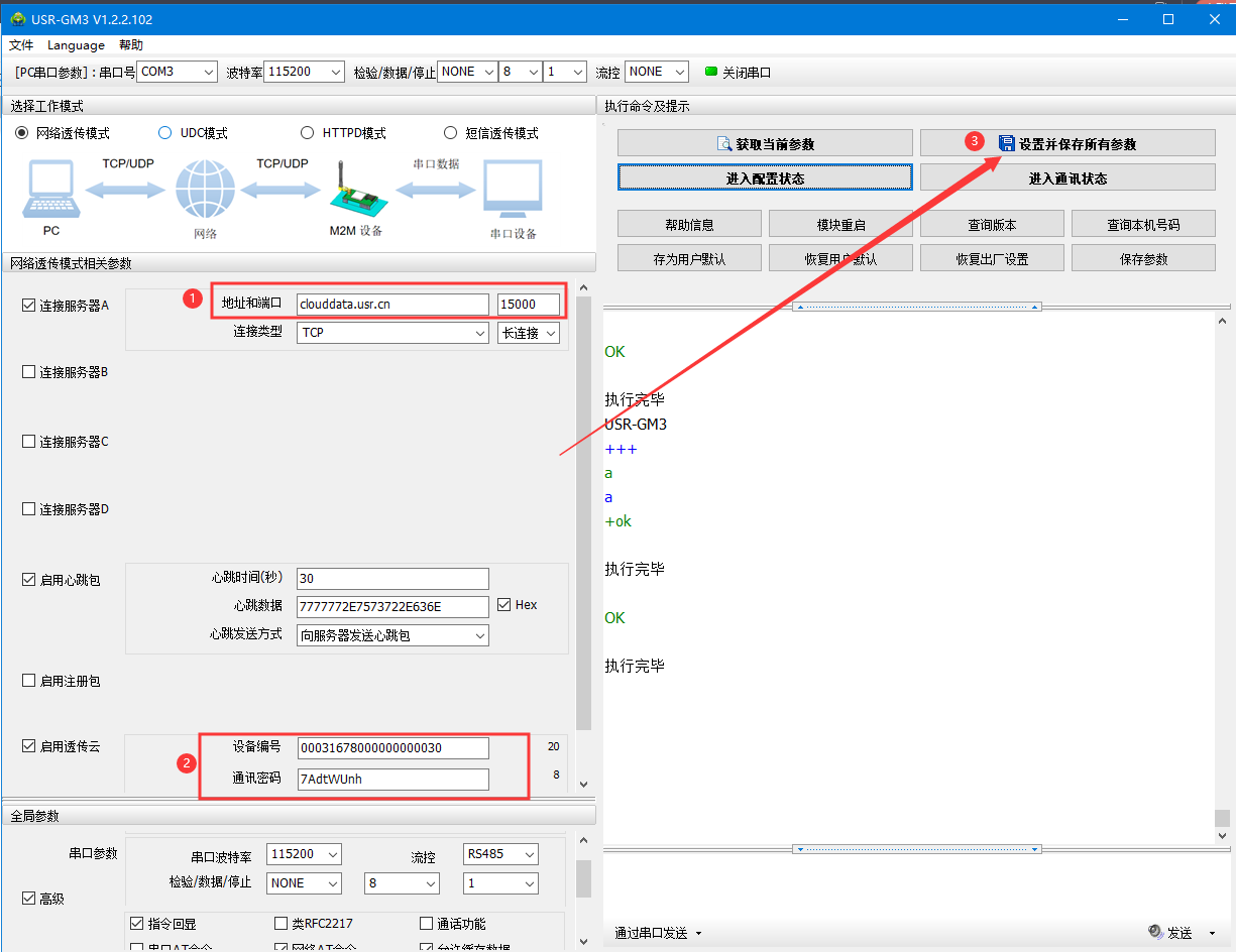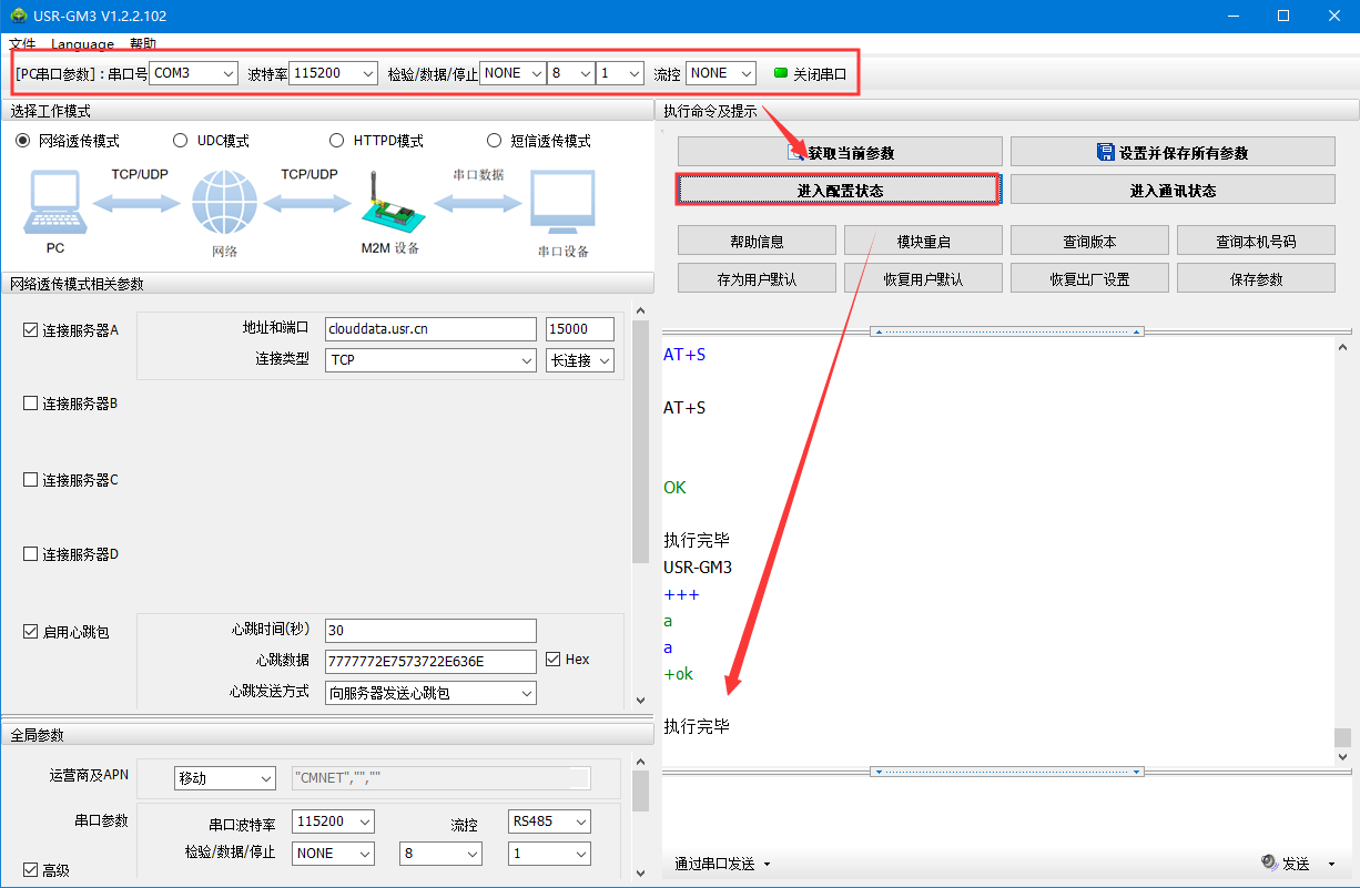 (2)默認(rèn)串口參數(shù)115200 N 8 1,打開串口——進(jìn)入配置狀態(tài)——返回OK說明進(jìn)入配置狀態(tài)成功