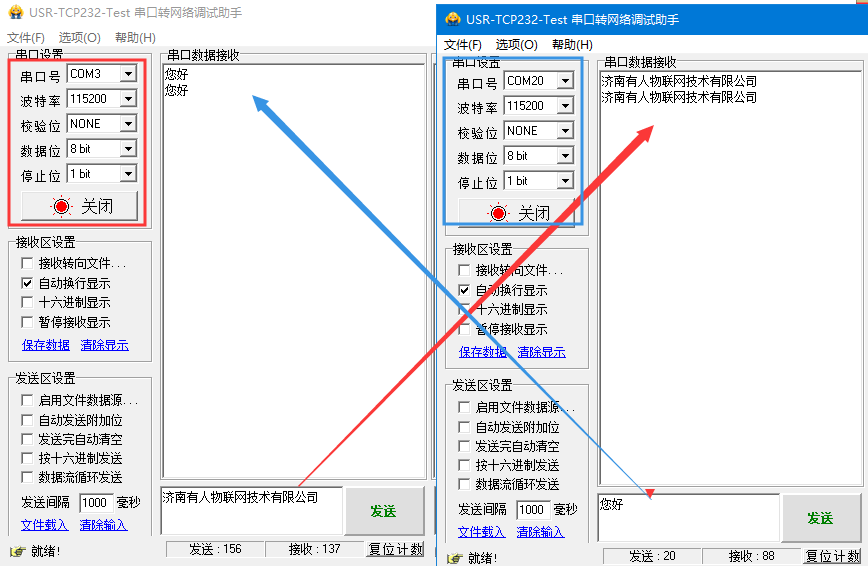 打開兩個USR-TCP232-TEST網(wǎng)絡(luò)助手,左側(cè)串口部分用COM3和虛擬串口COM20打開,串口參數(shù)和734設(shè)置一致。