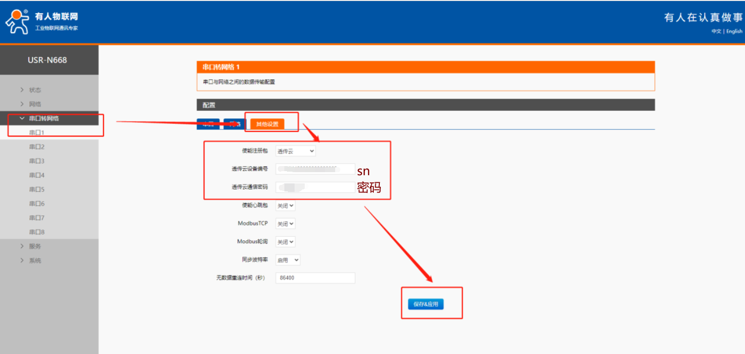 8.注冊包類型選擇透傳云,設(shè)備編號和密碼填寫為在云端添加設(shè)備生成的設(shè)備編號和密碼(SN與密碼可以通過操作按照圖示下面的案例獲取)(圖片中的為測試生成的,請?zhí)顚懽约旱脑O(shè)備編號和密碼)設(shè)置完成后點擊保存應(yīng)用。