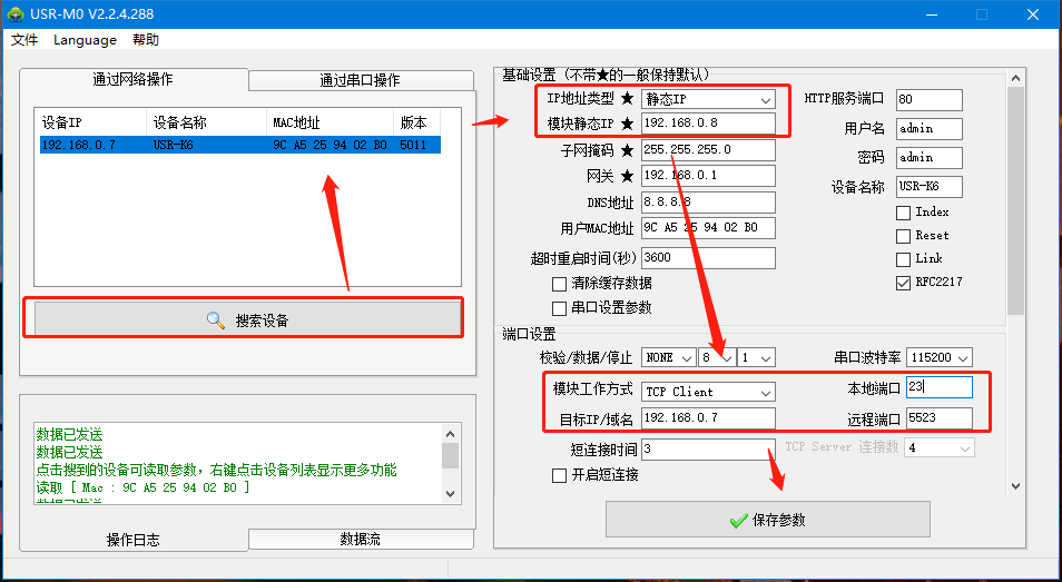 5、點(diǎn)擊“搜索設(shè)備”當(dāng)搜索列表中出現(xiàn)另一臺(tái)K6的設(shè)備后,點(diǎn)擊搜索到的設(shè)備,為了防止IP沖突,將此設(shè)備IP修改為192.168.0.8,模塊工作方式設(shè)為TCP Client,本地端口0,遠(yuǎn)程端口5523,點(diǎn)擊保存參數(shù)。