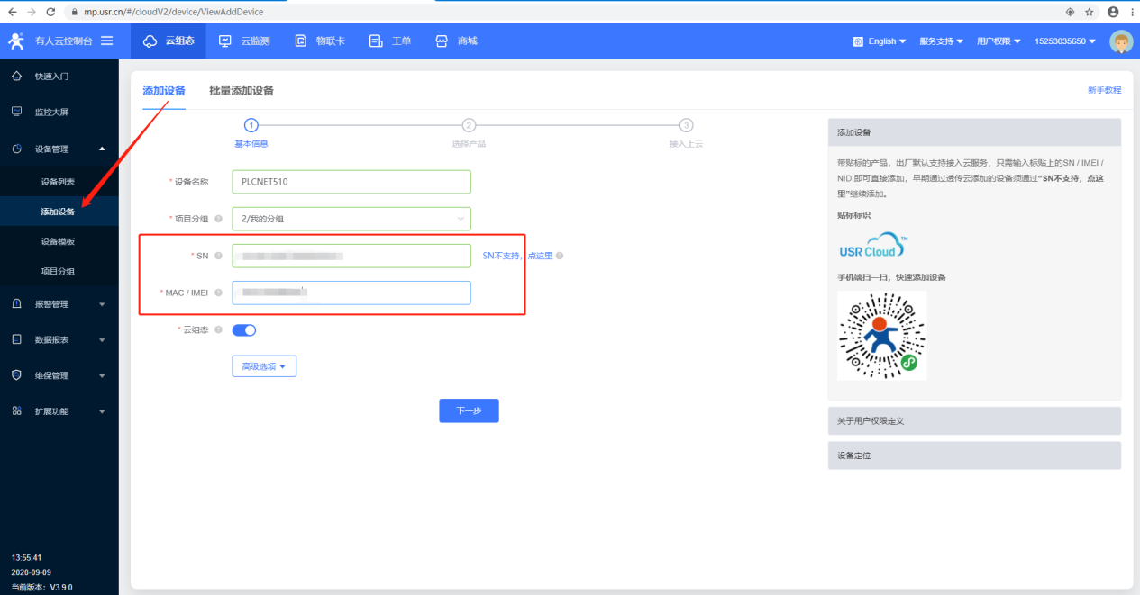 2.添加設(shè)備,使用PLCNET510背面標簽的MAC和SN添加,點擊下一步