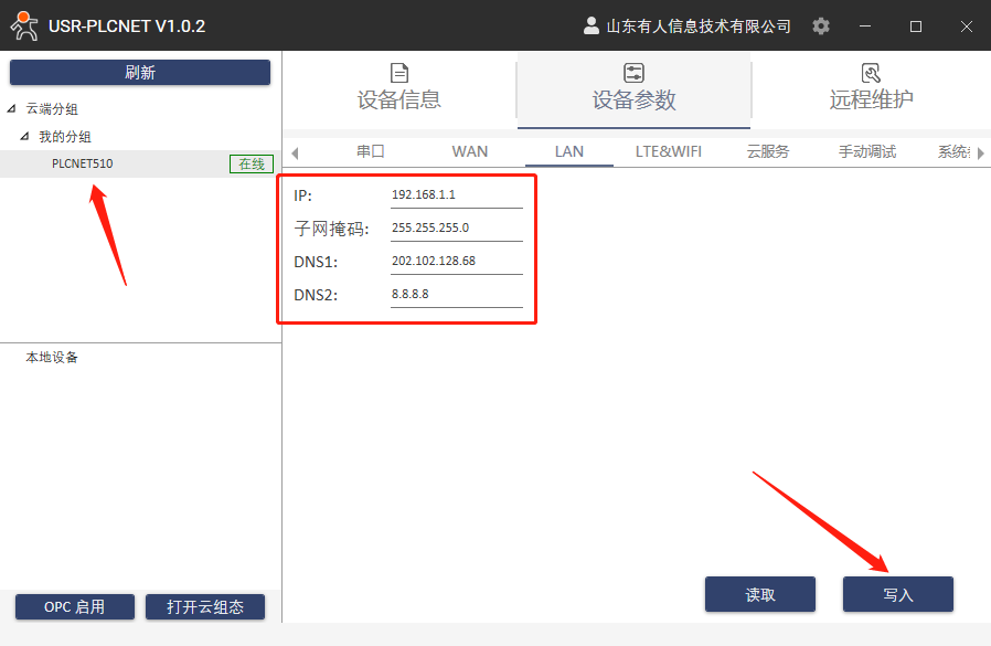 9.選中在線設(shè)備,設(shè)備參數(shù)》LAN,修改LAN口IP和PLC的網(wǎng)口IP在同一網(wǎng)段,點擊寫入