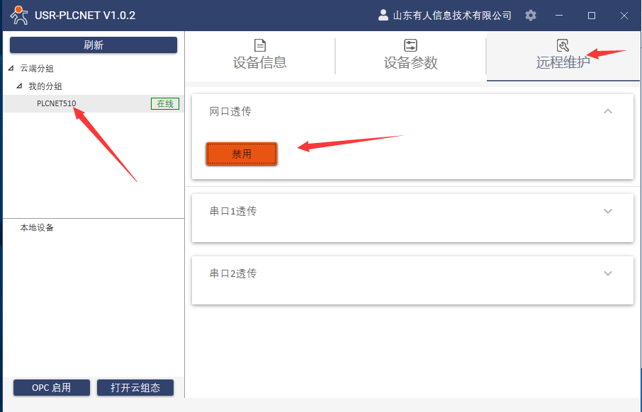 10.選中PLCNET510,選擇遠程維護,啟用網(wǎng)口透傳,電腦端會生成虛擬網(wǎng)卡