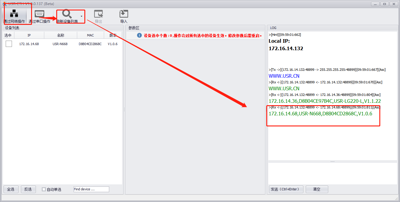 6、N668網(wǎng)線直連路由器,電腦設(shè)置為DHCP網(wǎng)線直連路由器,打開668設(shè)置軟件,通過網(wǎng)絡(luò)搜索,刷新設(shè)備列表,可以確認668此時的IP為:172.16.14.68。668的IP也可以在路由器內(nèi)置網(wǎng)頁確認。