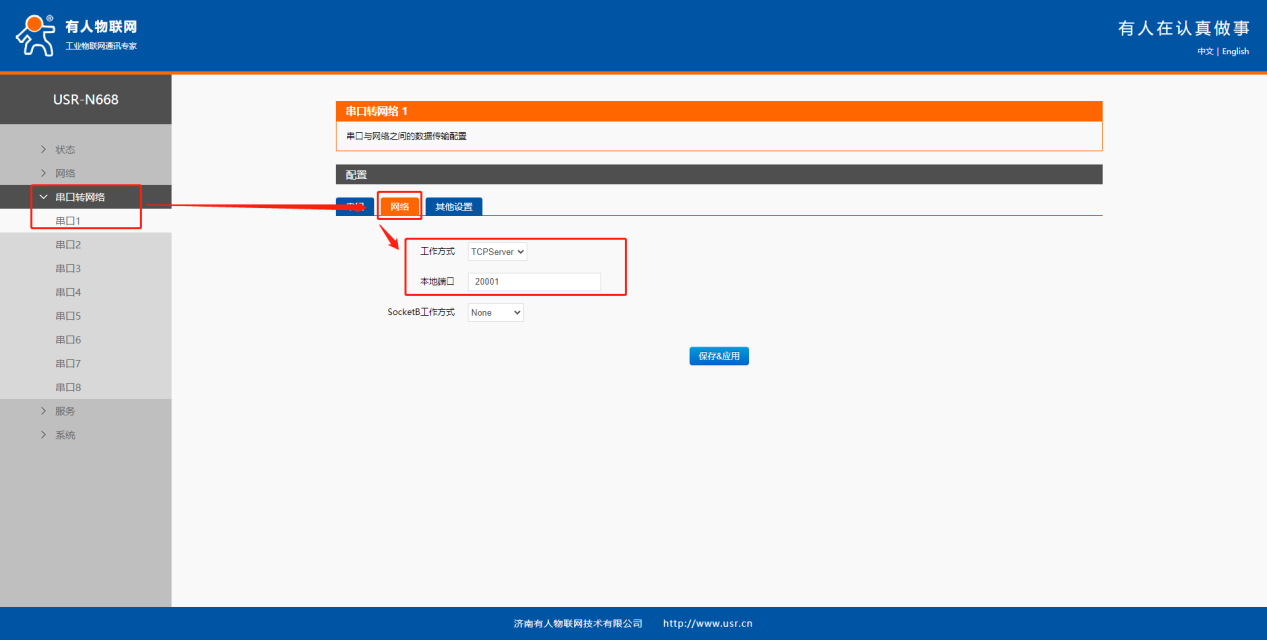 8、串口轉(zhuǎn)網(wǎng)絡(luò)確認工作方式為:TCP SERVER,本地端口號為20001。