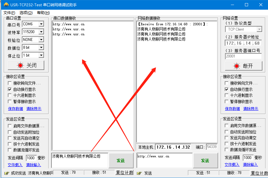 10、在串口和網(wǎng)絡(luò)之間進行數(shù)據(jù)收發(fā)測試,串口到網(wǎng)絡(luò)的數(shù)據(jù)流向是:PC串口->668串口->668以太網(wǎng)口->PC網(wǎng)絡(luò);網(wǎng)絡(luò)到串口的數(shù)據(jù)流向是:PC網(wǎng)絡(luò)->668以太網(wǎng)口->668串口->PC串口。具體演示如下圖所示: