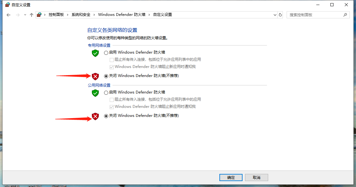 2、按路徑:控制面板找到“windows防火墻”和“更改適配器設(shè)置”選項(xiàng),關(guān)閉防火墻并禁用與本次測(cè)試無關(guān)的網(wǎng)卡。并關(guān)閉電腦殺毒軟件。