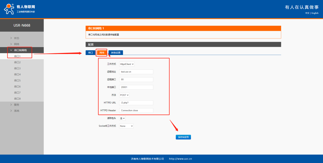 7、串口轉(zhuǎn)網(wǎng)絡(luò)確認(rèn)工作方式為:HttpClient,設(shè)置服務(wù)器地址為:test.usr.cn,端口號(hào):80(這個(gè)是我司測(cè)試服務(wù)器),設(shè)置請(qǐng)求類型為POST,報(bào)頭路徑為/2.php?,設(shè)置完成后點(diǎn)擊保存應(yīng)用。