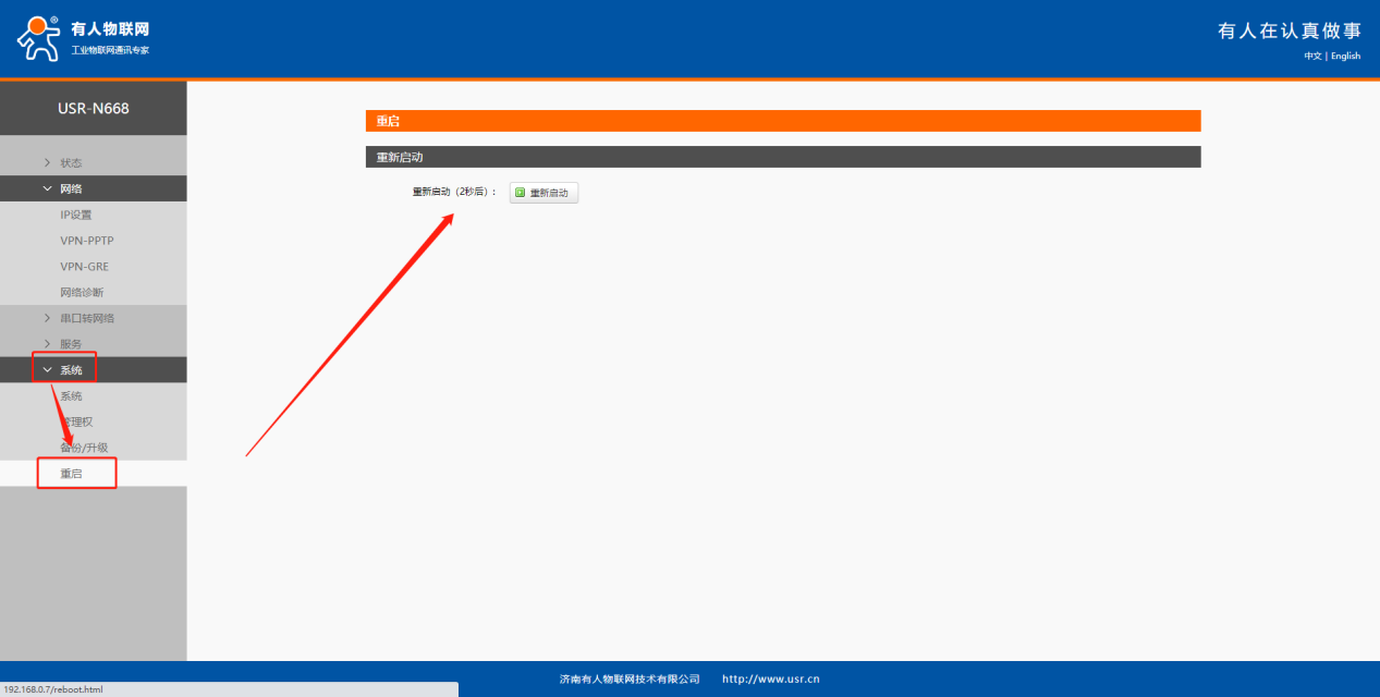 8、系統(tǒng)頁面重啟設(shè)備,參數(shù)需要重啟生效。然后直連路由器給668供網(wǎng)。