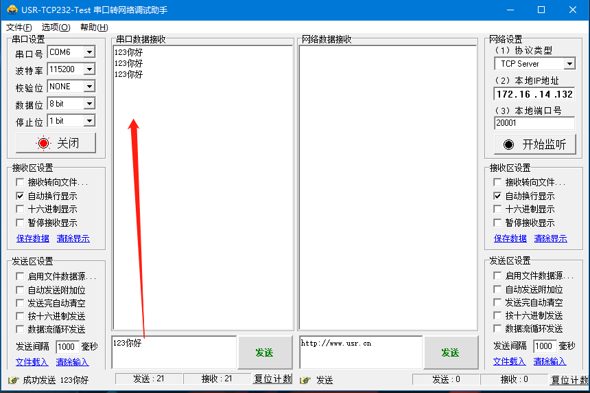 10、打開串口調(diào)試助手,打開正確的串口以及串口參數(shù),發(fā)送數(shù)據(jù)格式為:123你好,可以看到服務(wù)器返回的有效數(shù)據(jù)為123你好,具體測(cè)試截圖如下: