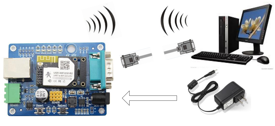 模塊的引腳輸出為 3.3V TTL 電平,不能直接和計(jì)算機(jī)連接,需要通過底板或 TTL 轉(zhuǎn) RS232 的轉(zhuǎn)接線再連 到計(jì)算機(jī)上;為了測試串口到 WIFI 網(wǎng)絡(luò)的通訊轉(zhuǎn)換,我們將模塊通過評估板的串口與計(jì)算機(jī)連接,WIFI 網(wǎng)絡(luò)也和計(jì)算機(jī)建立鏈接。由于需要同時具有 WIFI 和串口的特殊要求,這里采用臺式機(jī)加 WIFI 網(wǎng)卡的形式測試, 串口轉(zhuǎn)USB接臺式機(jī)。