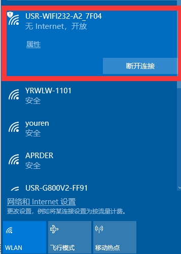 1、電腦打開無線網(wǎng)絡(luò)連接,搜索網(wǎng)絡(luò),如下圖的“USR-WIFI232-B2_xxxx”(xxxx 是 MAC 地址后四位)即是模塊的默認(rèn)網(wǎng)絡(luò)名稱(SSID)。電腦關(guān)閉防火墻與殺毒軟件并禁用除了wifi之外其他的網(wǎng)卡。