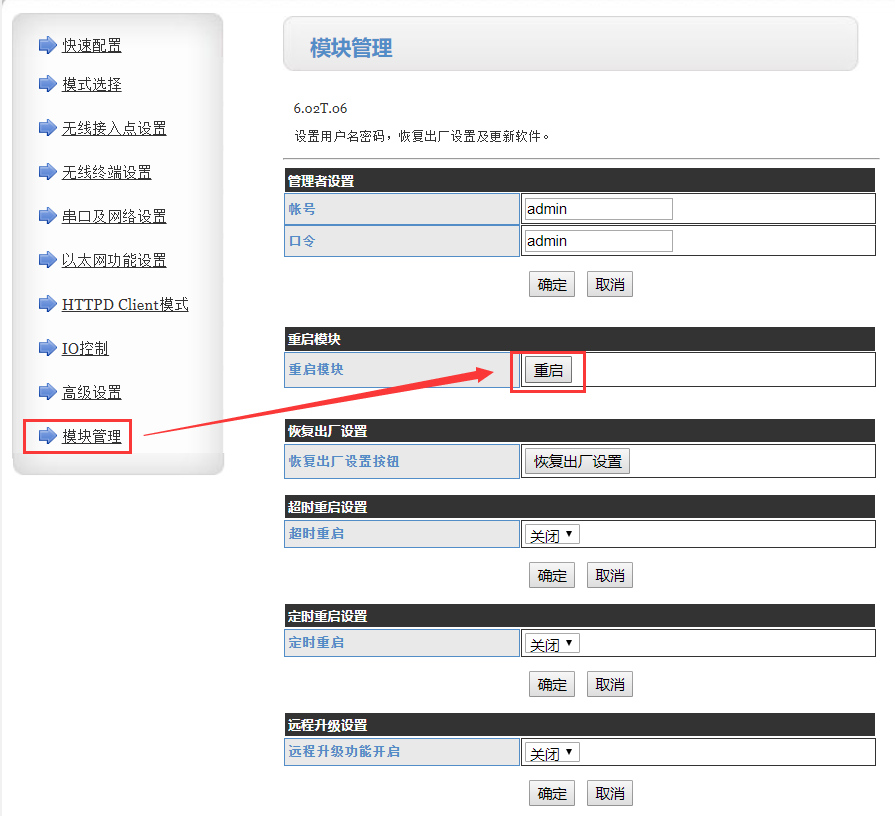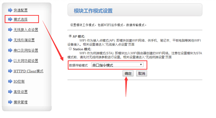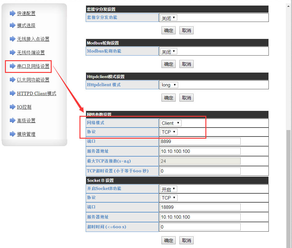 2、電腦瀏覽器地址欄輸入模塊默認(rèn)IP:10.10.100.254,賬號和密碼都是admin,進(jìn)入內(nèi)置網(wǎng)頁,模式選擇 -> 數(shù)據(jù)傳輸模式 -> 串口指令模式,點(diǎn)擊確定,串口及網(wǎng)絡(luò)設(shè)置 -> 網(wǎng)絡(luò)參數(shù)設(shè)置 -> 網(wǎng)絡(luò)模式配置為client,點(diǎn)擊確定,重啟模塊。