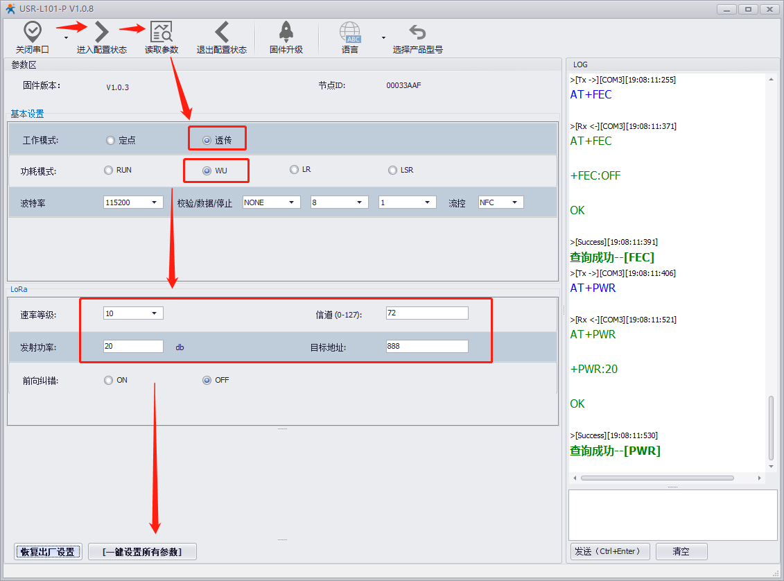 打開LoRa設(shè)置軟件(L101-P),依次點(diǎn)擊打開串口(選擇A對應(yīng)的串口號,串口參數(shù):115200,None,8,1,NFC)、進(jìn)入配置狀態(tài)、讀取參數(shù)、