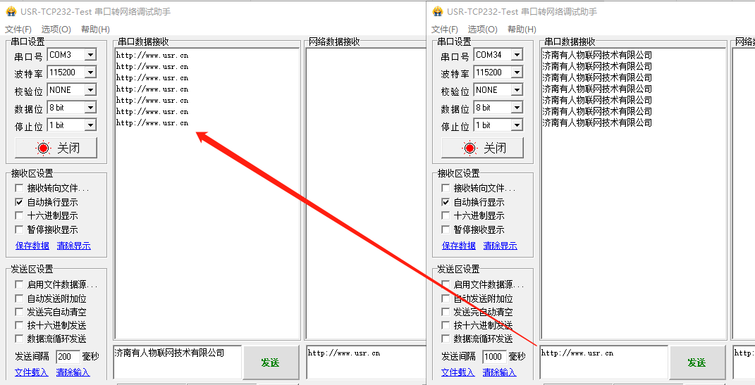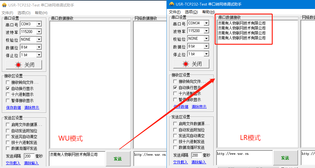 啟動兩個USR-TCP232-Test(模擬串口設(shè)備1,2)分別連接LoRa數(shù)傳終端A(com3)、B(com34)的串口,使用WU設(shè)備發(fā)送數(shù)據(jù)LR設(shè)備可接收數(shù)據(jù),通信效果如下圖所示: