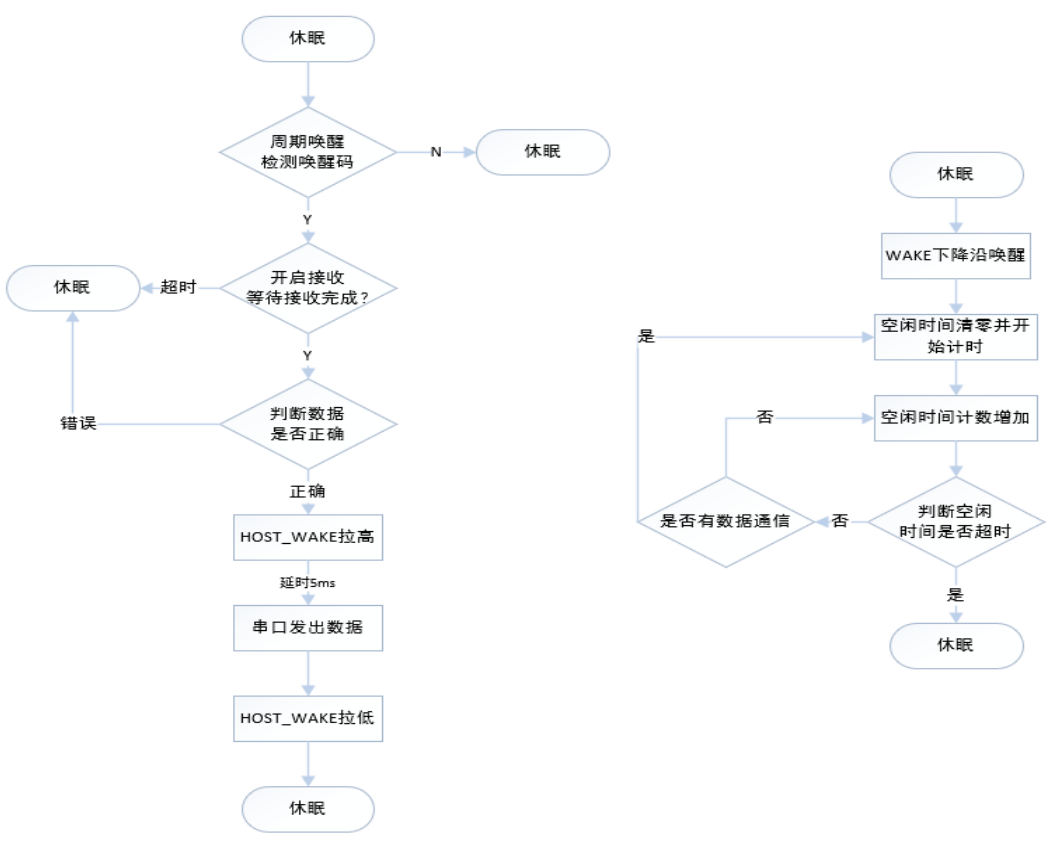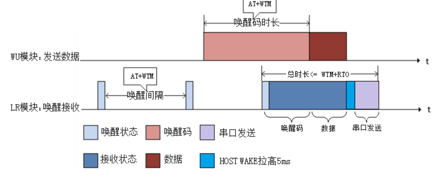 LR 低功耗接收模式,上電后如果無線和串口持續(xù)一定時間無數(shù)據(jù)通信則模塊進(jìn)入休眠,休眠后模塊 定期(AT+WTM 設(shè)置喚醒間隔)喚醒來檢測喚醒碼,如果檢測到喚醒碼模塊立即進(jìn)入接收狀態(tài),等待接收 完成,接收完成后 HOST_WAKE 引腳會在串口發(fā)送數(shù)據(jù)前拉高 5ms,數(shù)據(jù)發(fā)送完成拉低(客戶可使用 HOST_WAKE 引腳喚醒自己的 MCU),若只檢測到喚醒碼未接收到數(shù)據(jù),則等待超時后進(jìn)入休眠狀態(tài)。 休眠后也可以通過 WAKE 引腳下降沿中斷來喚醒模塊,喚醒后的模塊恢復(fù)運(yùn)行模式,當(dāng)空閑時間大于 設(shè)定時間時模塊再次進(jìn)入休眠狀態(tài)。