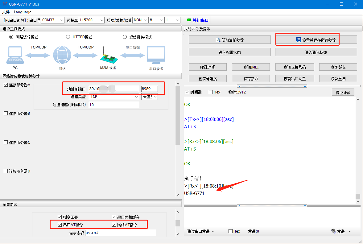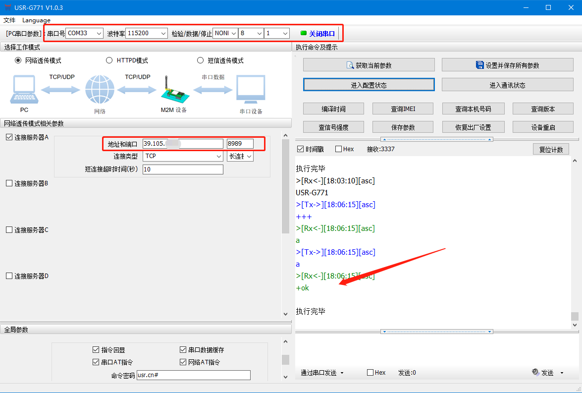 注:點(diǎn)擊進(jìn)入配置狀態(tài),如果模塊能返回+ok的字符,說明電腦和模塊連接是沒有問題的