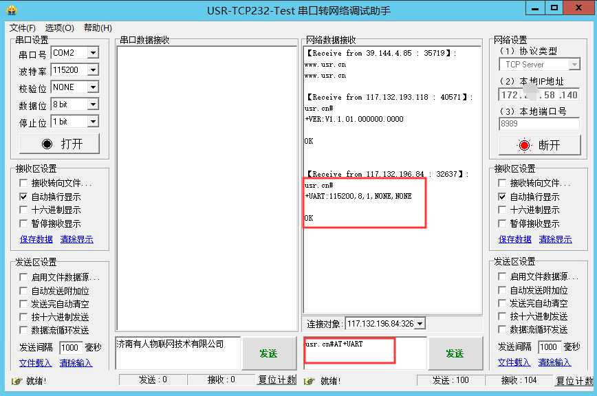 (4)查詢版本:在串口發(fā)送usr.cn#AT+VER+回車換行 可以看到模塊返回固件版本號