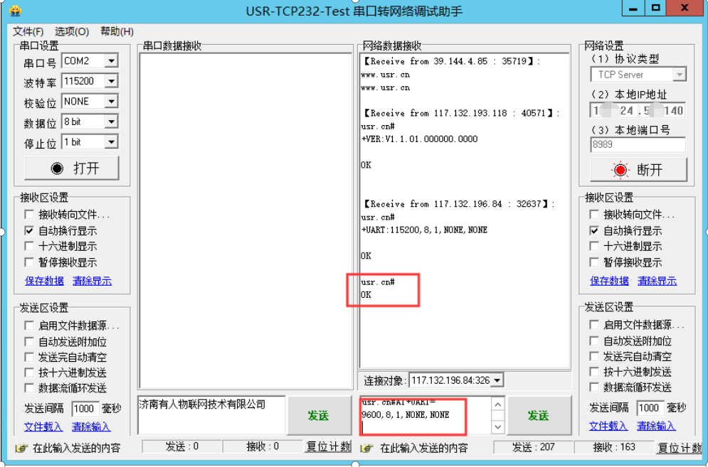 (7)更改以后發(fā)送usr.cn#AT+S+回車換行 重啟以后參數(shù)保存成功;然后重新建立連接以后查詢串口參數(shù),可以看到串口波特率已經(jīng)變?yōu)?600