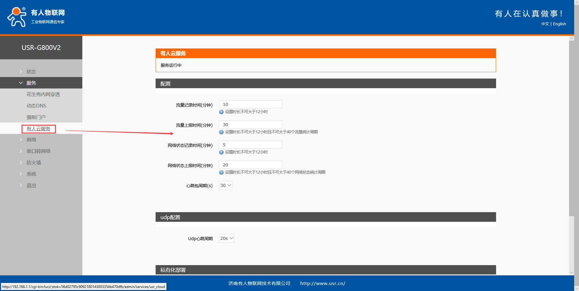 2、V1.0.24以上固件默認開啟有人云服務功能。界面可以配置統(tǒng)計流量、網(wǎng)絡狀態(tài)、心跳包的上報參數(shù);同時支持數(shù)據(jù)上報到私有部署的有人云服務器地址