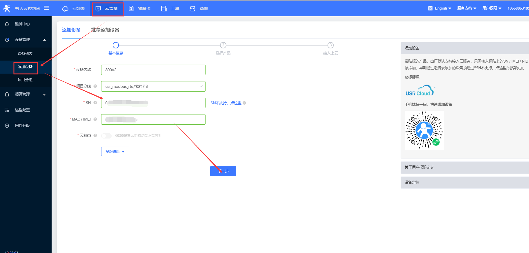 添加設備,點擊設備管理中的添加設備,之后將設備SN和IMEI添加。在有人云云監(jiān)測中添加時需要設備的MAC、IMEI、SN這些參數(shù),參數(shù)都設備便簽上可以查看,添加完成后點擊下一步,確認添加