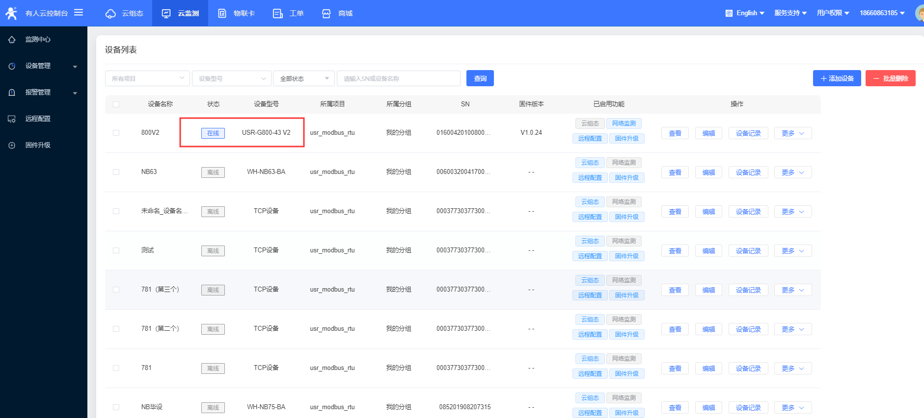 5、設備添加完成,重新上電或等待一會后云監(jiān)測中設備上線,至此在有人云上添加設備完成