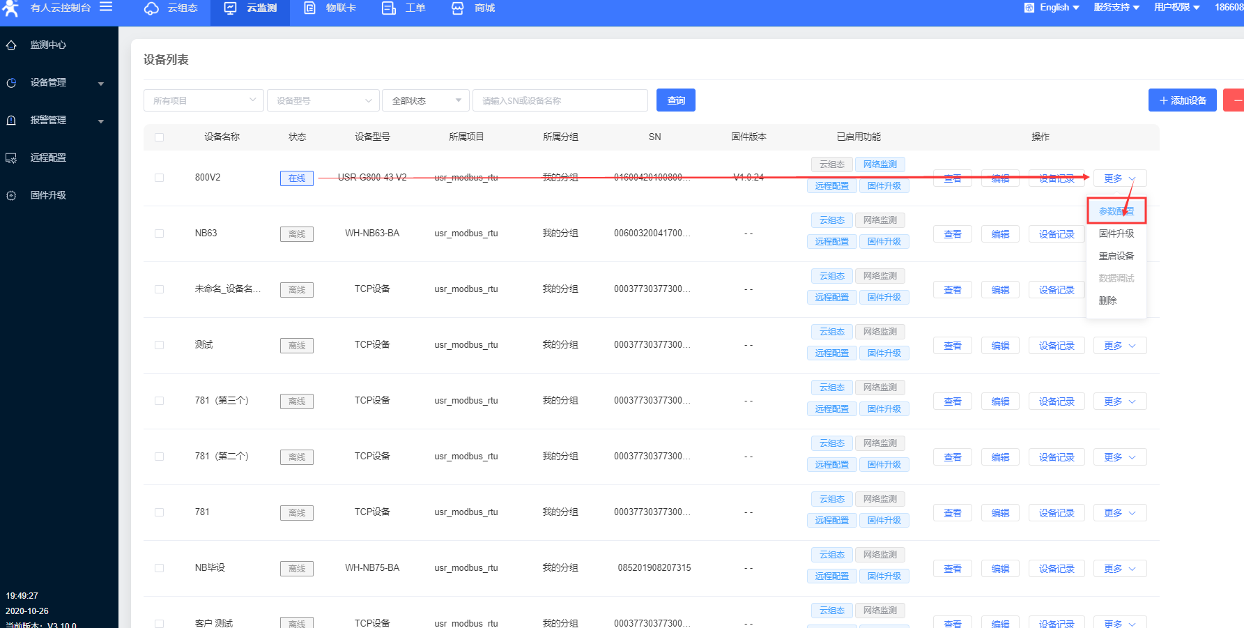 在“云監(jiān)測”的“設備列表”下,找到想要進行參數(shù)配置的設備,點擊“更多”,選擇“參數(shù)配置”