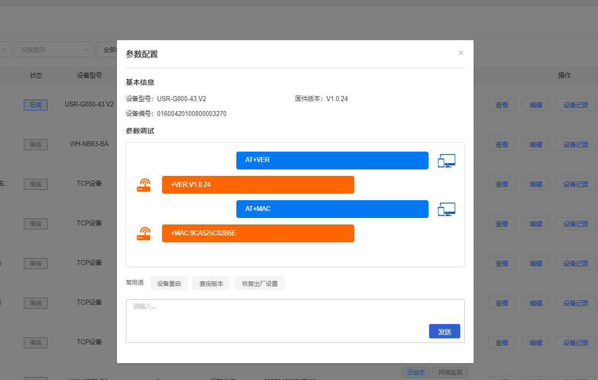 在參數(shù)配置界面,可以輸入指令來進行配置設備的某些參數(shù),或者讀取設備的某些參數(shù),并且參數(shù)的返回也會顯示在平臺上面
