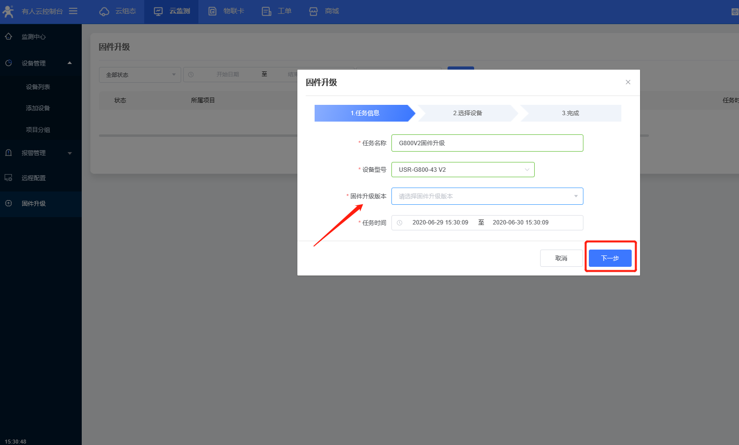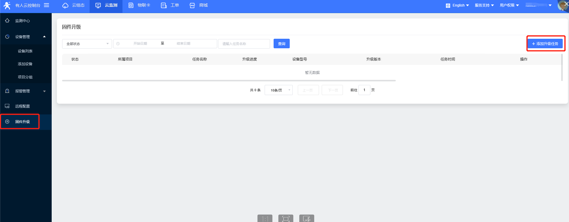 也可以在在“云監(jiān)測”的“固件升級”下,點擊“添加升級任務”。