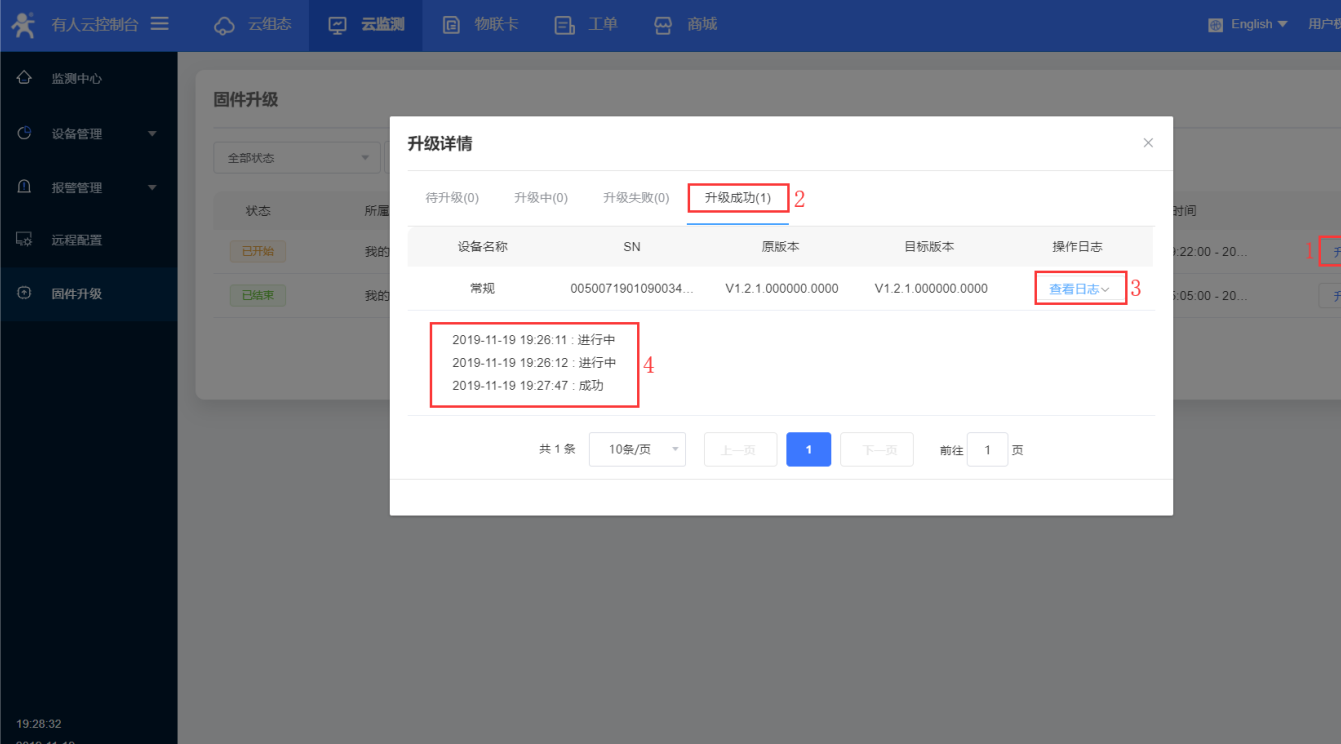 在“升級詳情”里面查看當前固件升級進度,并且可以在“查看日志”里面查看詳細信息。