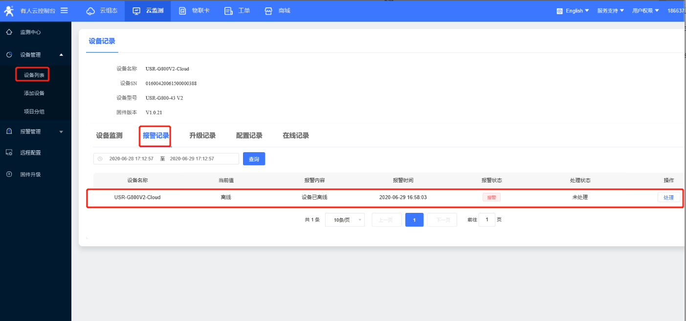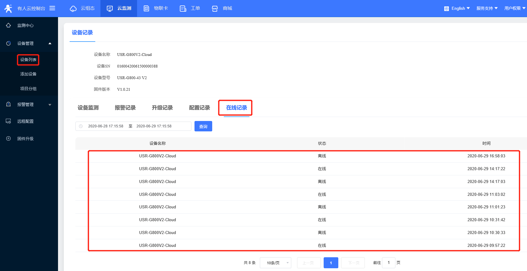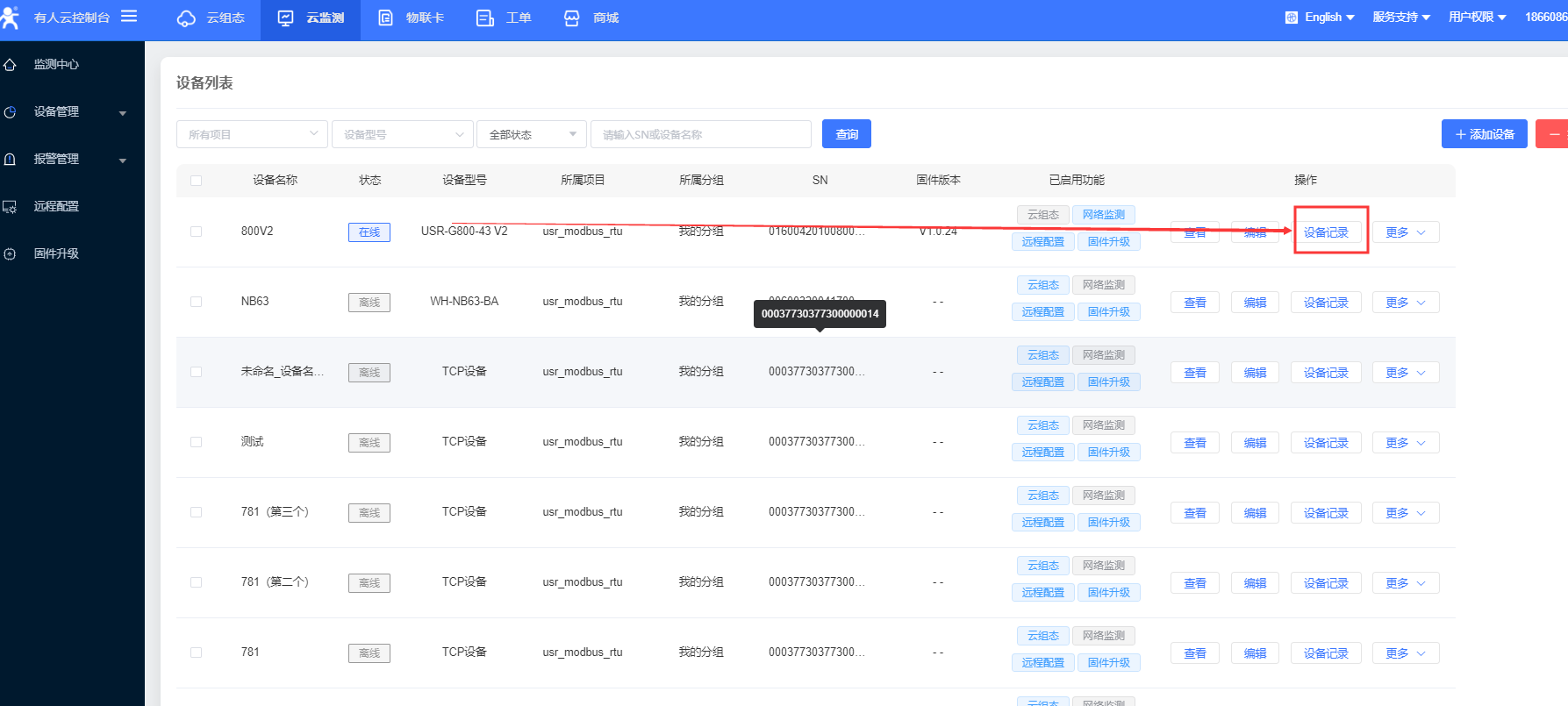 在“云監(jiān)測”的“設備列表”下,找到相應設備,點擊“設備記錄”,頁面會顯示當前設備歷史信息