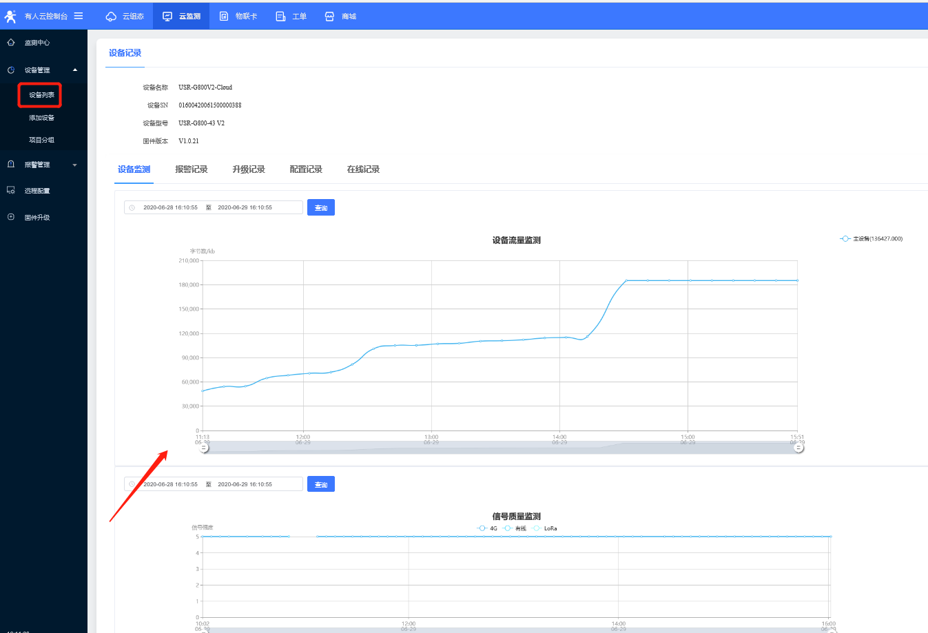 在“設備監(jiān)測”一欄可以看到設備某個時間段的流量曲線、信號曲線