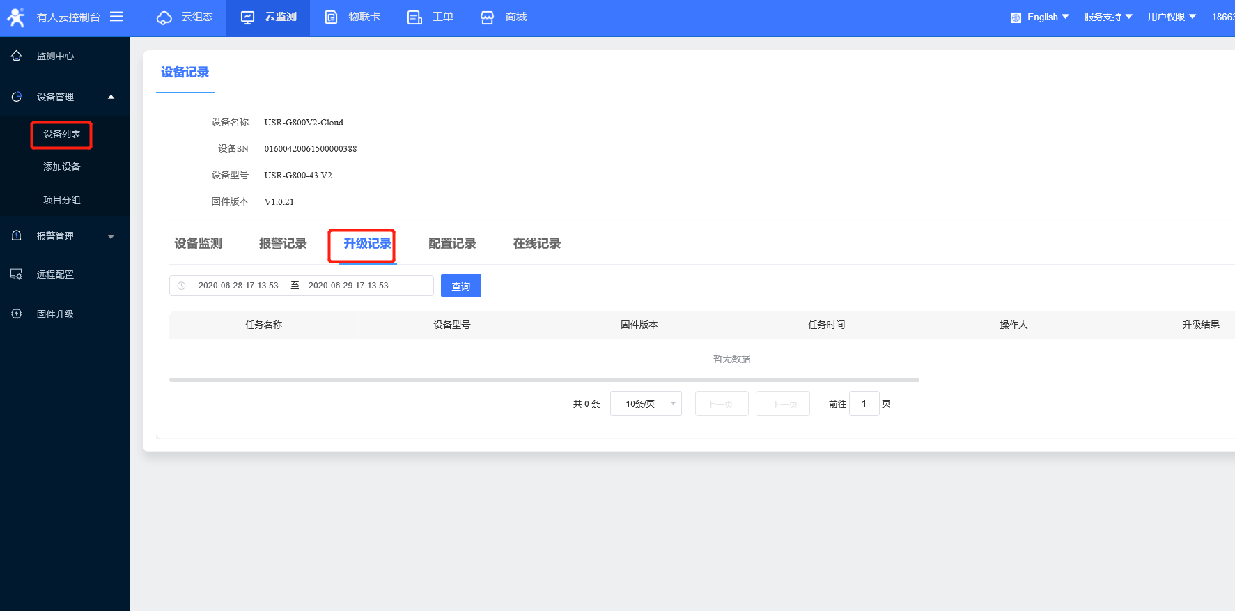 在“升級記錄”一欄可以看到設備在某個時間段有沒有進行過固件升級。由于當前設備沒有進行過升級,所以沒有記錄
