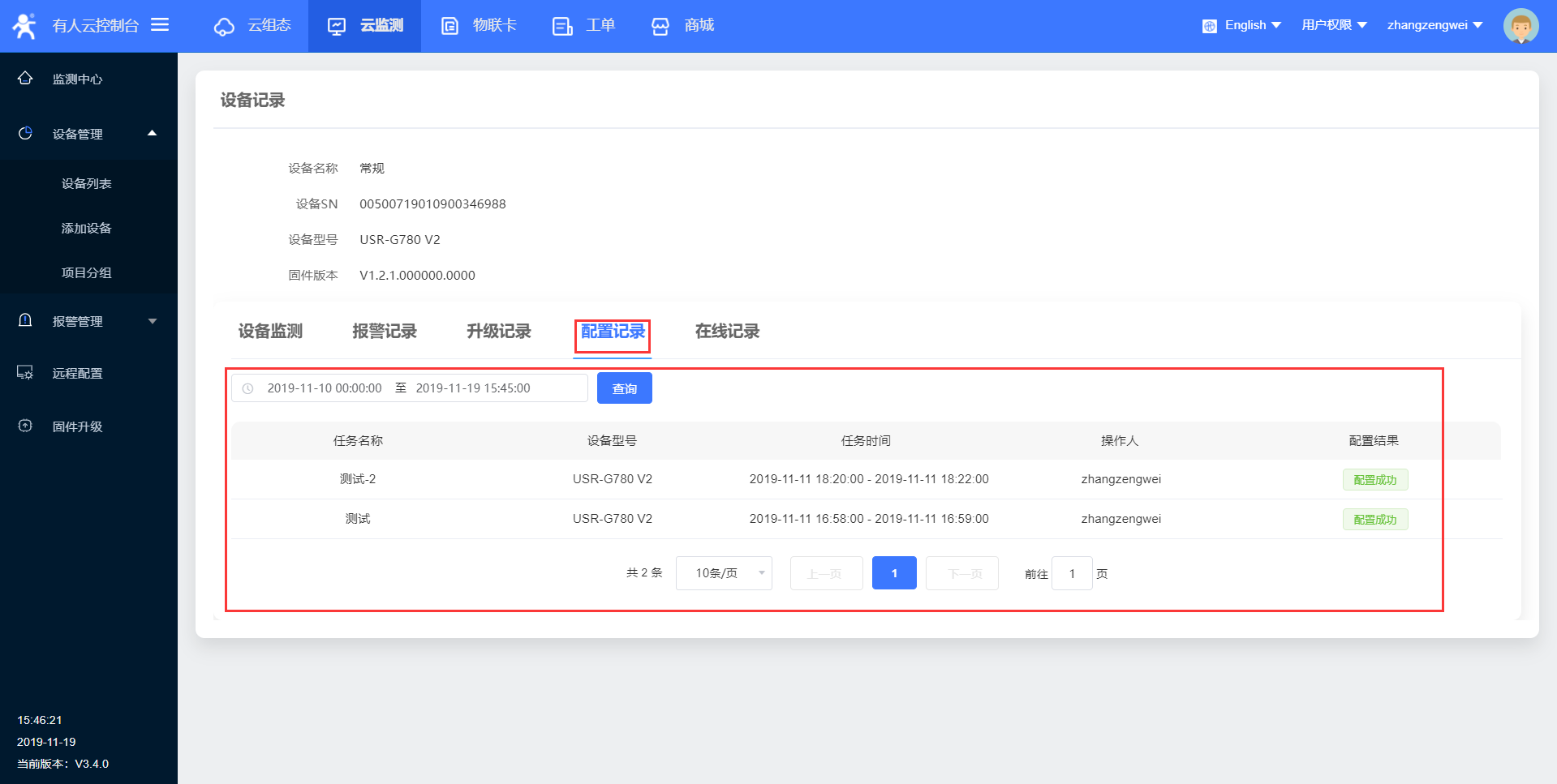 在“配置記錄”一欄可以看到設備在某個時間段的遠程配置任務的執(zhí)行情況