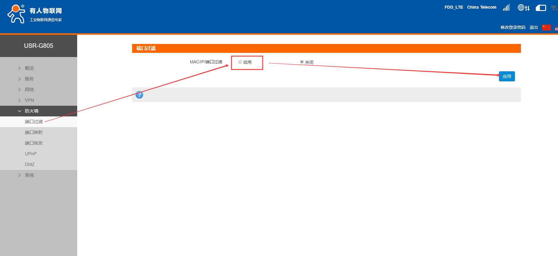 4. 在內(nèi)置網(wǎng)頁(yè)--防火墻中端口過濾界面進(jìn)行設(shè)置,啟用此功能之后點(diǎn)擊應(yīng)用。