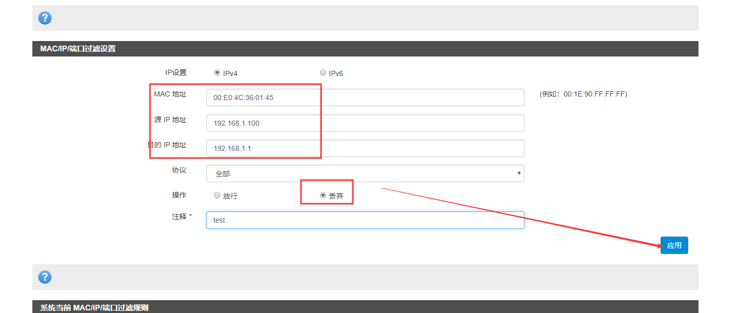5.MAC和源IP地址設(shè)置連接805 的下級(jí)終端的MAC和IP,目標(biāo)IP設(shè)置禁止訪問的IP,協(xié)議選擇全部,操作設(shè)置丟棄。