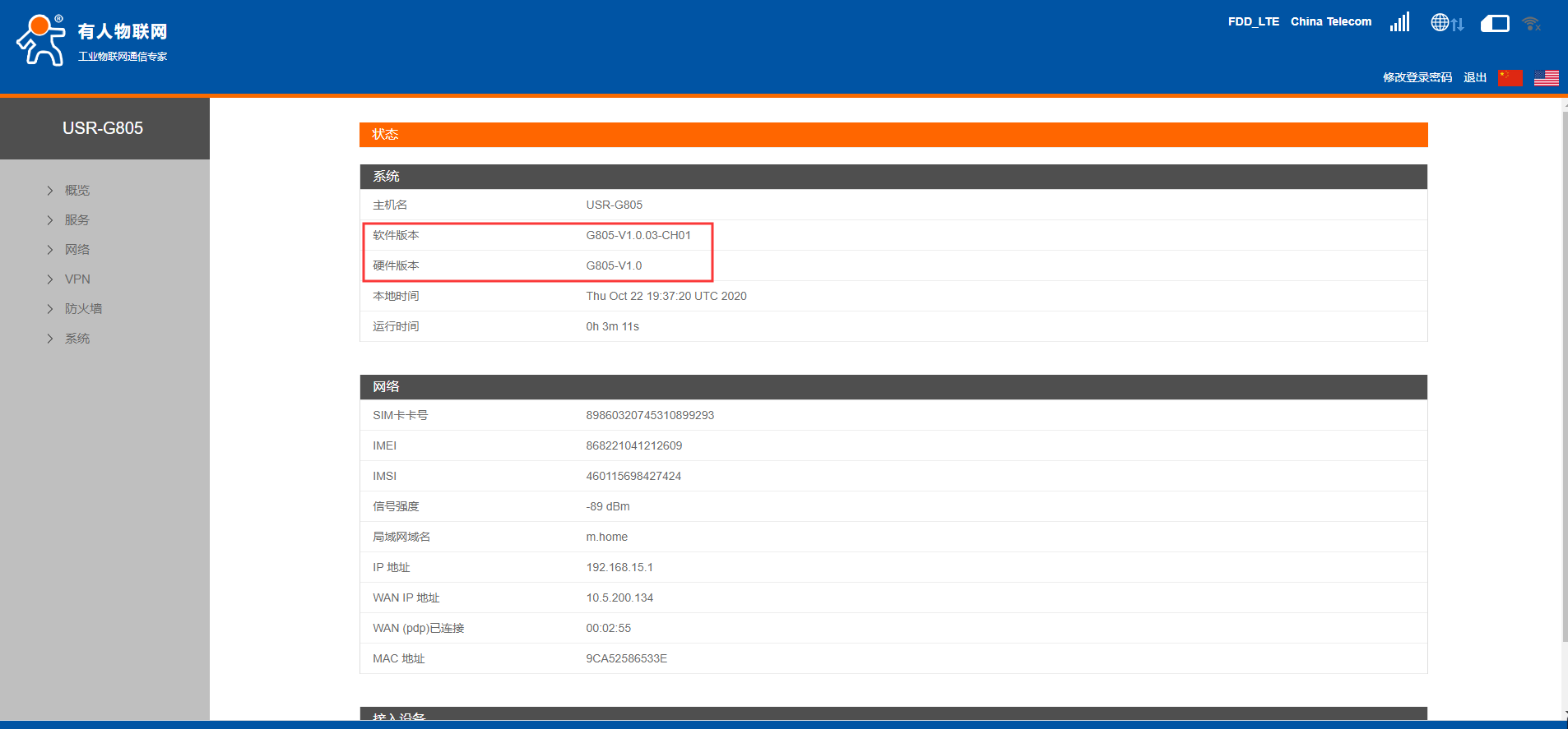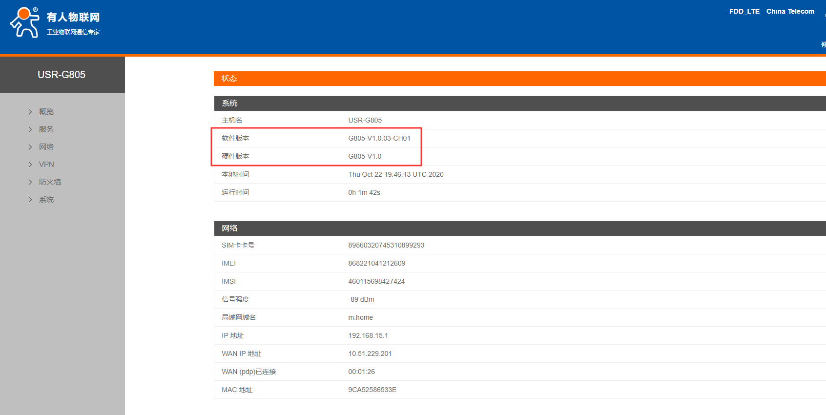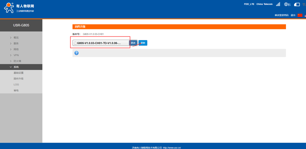 4.在概述--狀態(tài)界面可以看到硬件版本V1.0,軟件版本號(hào)為V1.0.03-CH01,現(xiàn)在將模塊固件升級(jí)為V1.0.06-release