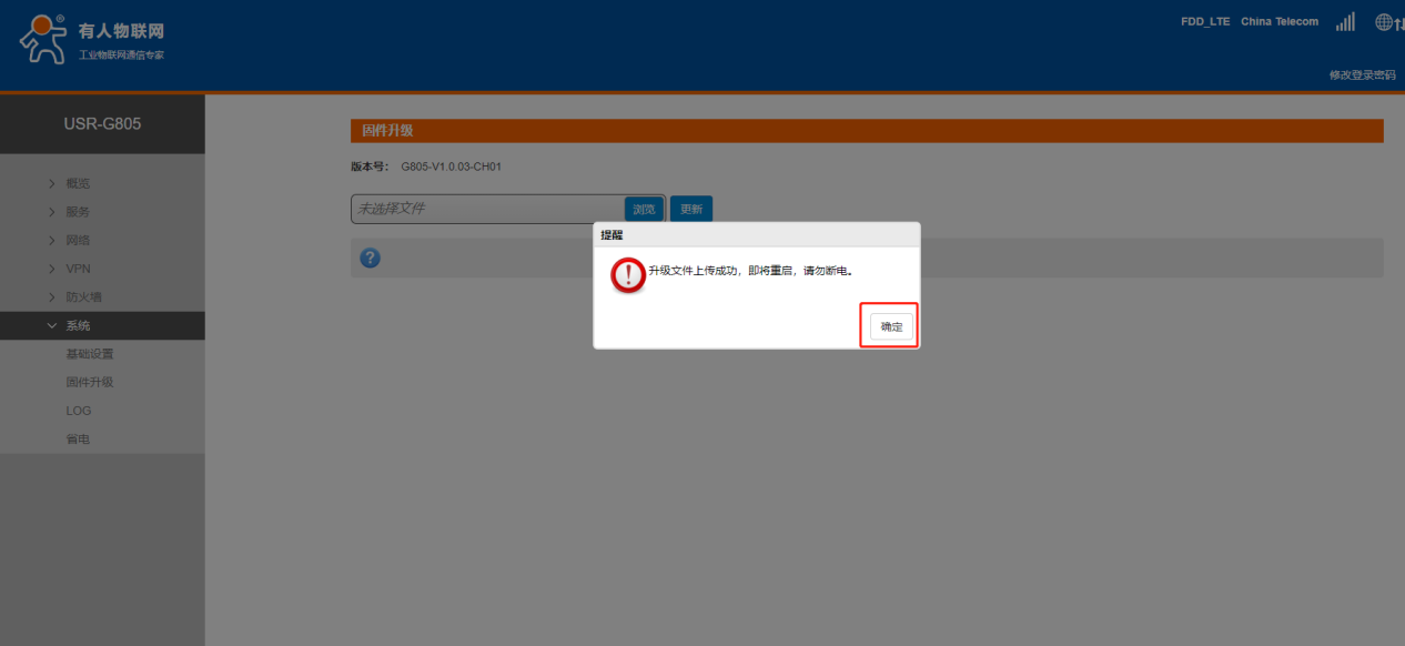 7.文件上傳成功后,會(huì)收到模塊即將重啟的提示,點(diǎn)擊確定。在升級(jí)過程中請(qǐng)勿關(guān)閉電源。(升級(jí)過程中設(shè)備斷電會(huì)造成死機(jī),無法使用)