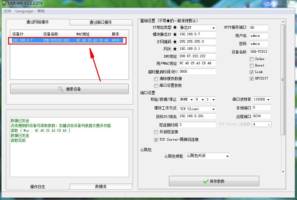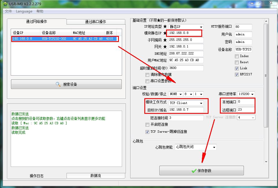 用M0設(shè)置軟件搜索設(shè)備,獲取302 的IP參數(shù)