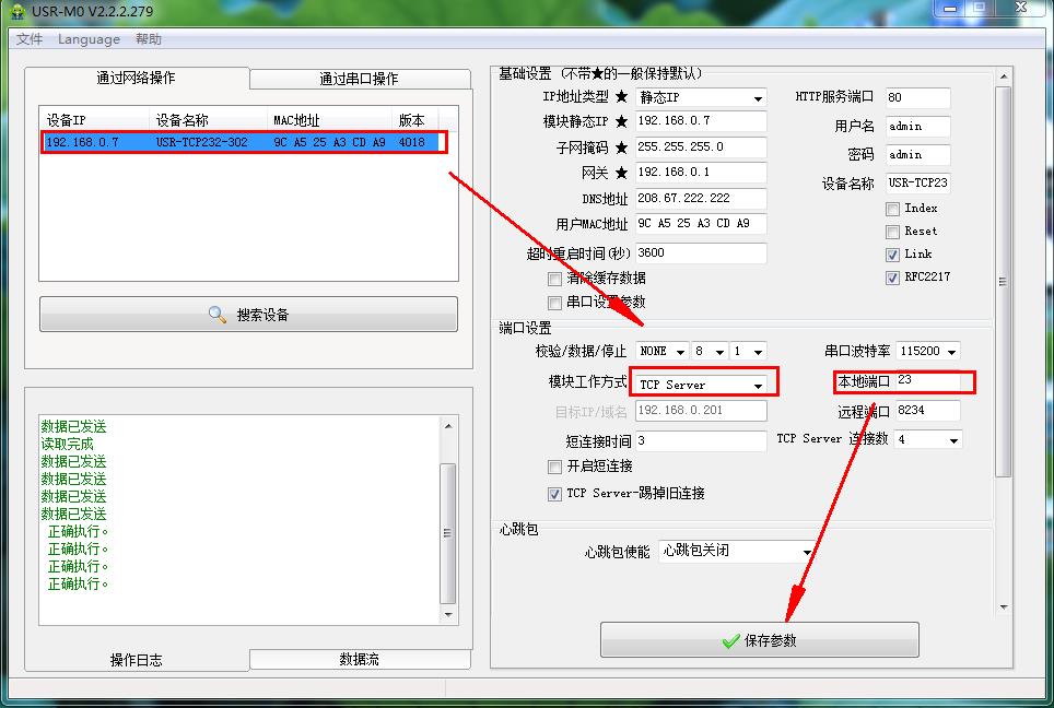 點(diǎn)擊302的IP,將302IP設(shè)置192.168.0.7,工作方式TCP server,本地端口23
