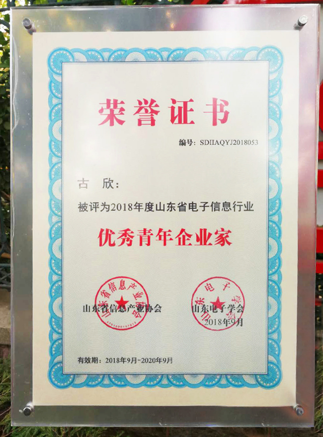 古欣被授予“2018年度山東省電子信息行業(yè)優(yōu)秀青年企業(yè)家”榮譽(yù)稱號(hào)