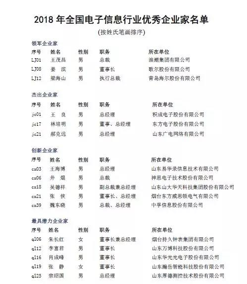 經(jīng)過評(píng)審,山東省信息產(chǎn)業(yè)協(xié)會(huì)、山東電子學(xué)會(huì)推薦共29位企業(yè)家榮獲“2018年全國電子信息行業(yè)優(yōu)秀企業(yè)家”榮譽(yù)稱號(hào),名單如下: