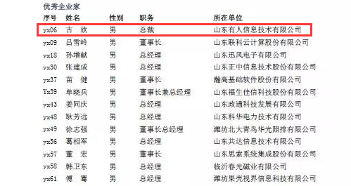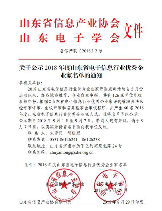 2018年9月,根據(jù)《山東省電子信息行業(yè)優(yōu)秀企業(yè)評(píng)審管理辦法》,本著“公正、公平、公開”的原則,山東省信息產(chǎn)業(yè)協(xié)會(huì)、山東電子學(xué)會(huì)在山東省126家申報(bào)單位中,經(jīng)過初審、復(fù)核、專家評(píng)審,遴選了60位“全省電子信息行業(yè)優(yōu)秀企業(yè)家”,并擇優(yōu)推薦參加中國電子企業(yè)協(xié)會(huì)組織的“國家級(jí)電子信息行業(yè)優(yōu)秀企業(yè)家”評(píng)選活動(dòng)。