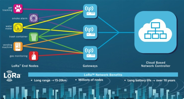 與上面列出的一樣, LoRaWAN是用于與互聯(lián)網(wǎng)進(jìn)行數(shù)據(jù)通信的無線連接網(wǎng)絡(luò)。LoRaWan迅速脫穎而出,因?yàn)樗殉蔀槲锫?lián)網(wǎng)(物聯(lián)網(wǎng))應(yīng)用的知名和量身定制,需要遠(yuǎn)程和低功耗連接到互聯(lián)網(wǎng)而無需WiFi。對(duì)于遠(yuǎn)程電池供電的傳感器或遠(yuǎn)距離通信或遠(yuǎn)程通信的設(shè)備,LoRaWan是一個(gè)很好的解決方案。LoRaWan簡單地說,包裹數(shù)據(jù)在需要時(shí)通過長距離發(fā)送到最近的,最可用的網(wǎng)關(guān),該網(wǎng)關(guān)將所述數(shù)據(jù)包轉(zhuǎn)發(fā)到服務(wù)器以進(jìn)行存儲(chǔ),計(jì)算或可視化。