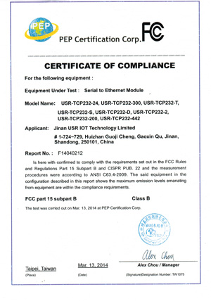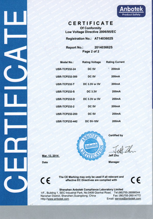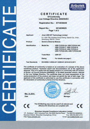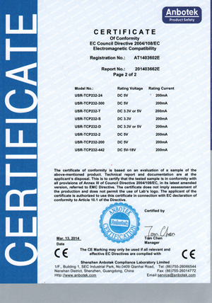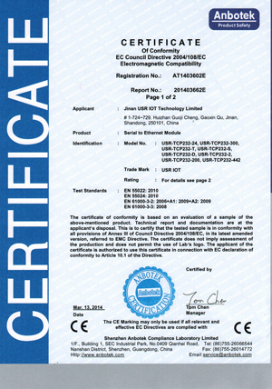 2014年3月28日,在公司全體員工共同努力下,在做了大量的技術和管理工作后,我公司USR-T24系列核心成功獲得CE認證證書, CE證書的獲得標志著有人科技取得了順利進入歐盟及歐盟自由貿易協(xié)會國家市場的通行證,為公司海外市場的開拓奠定了基礎;同時也標志我公司的產品又上了一個新臺階!